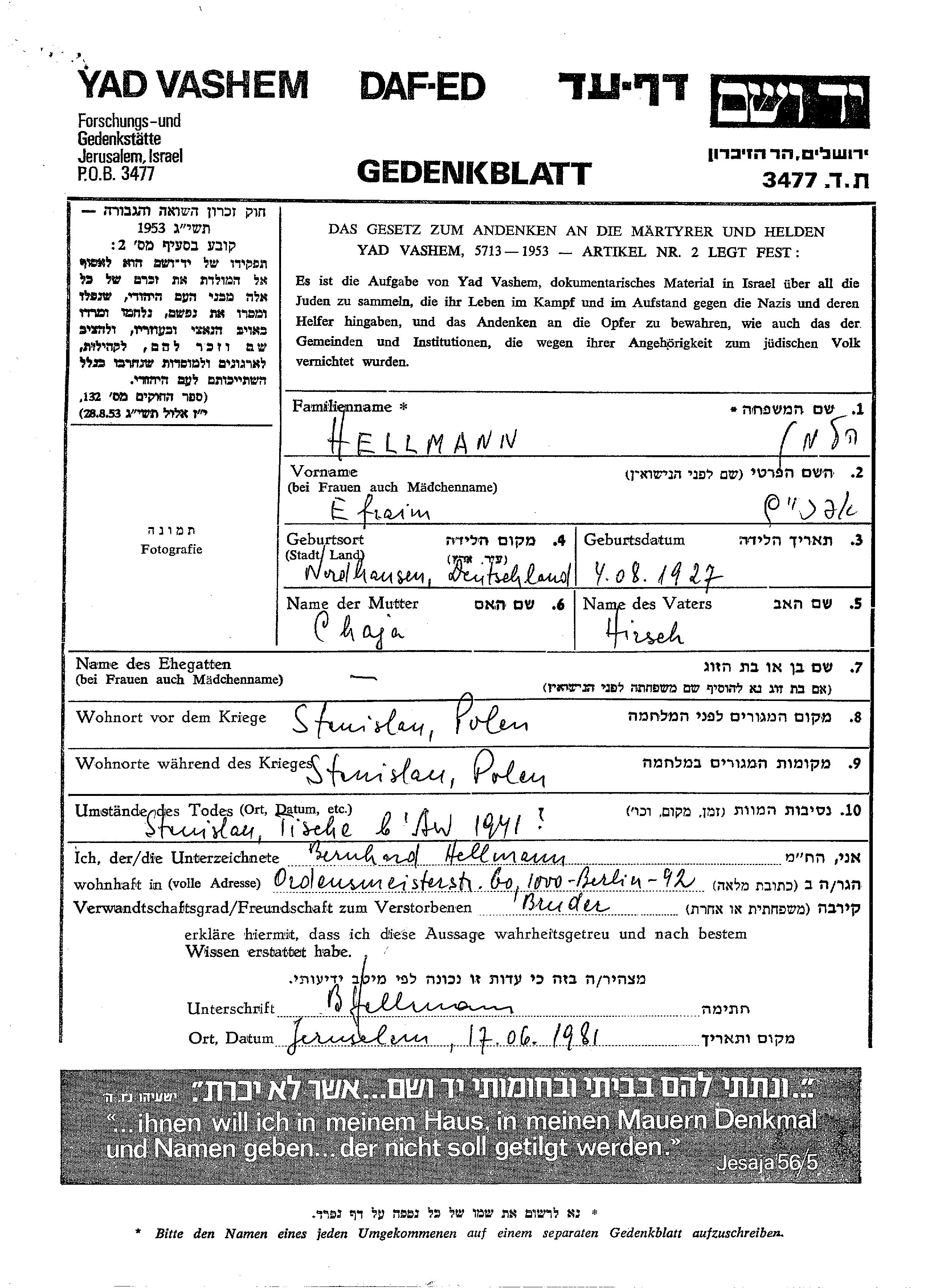 Hellman Efraim 1927 Stanislau, Pologne Feuille de témoignage