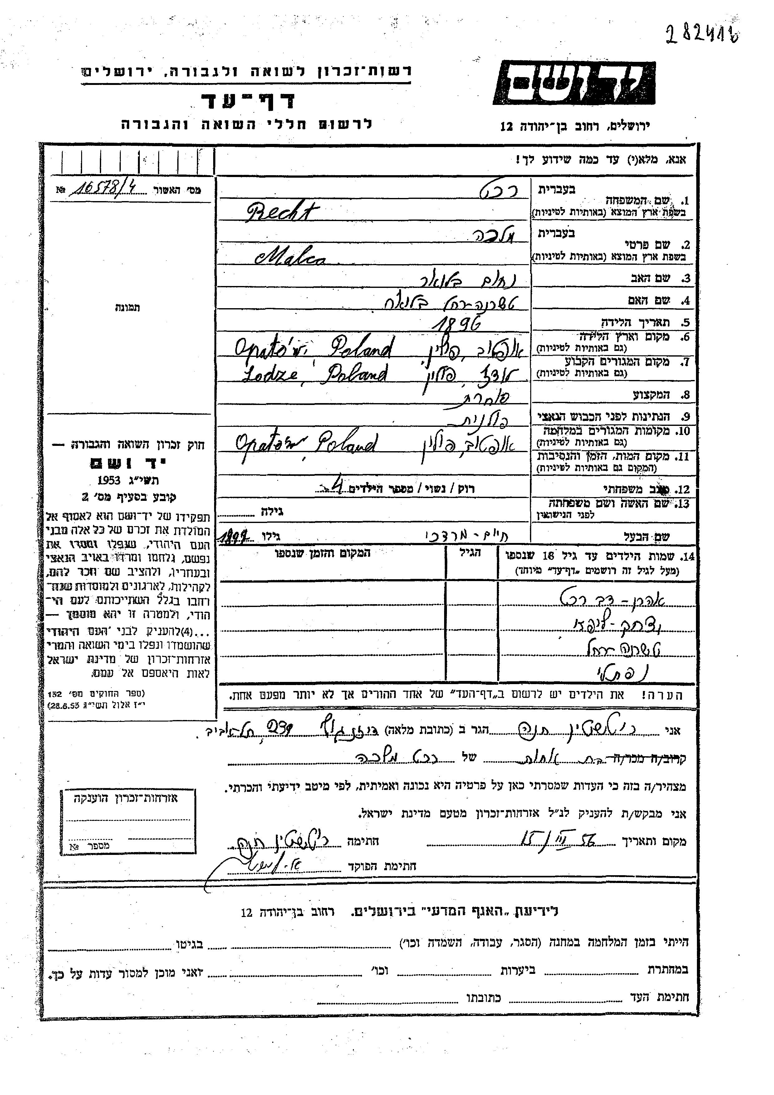 Recht Charna Rakhel Lodz, Pologne Feuille de témoignage