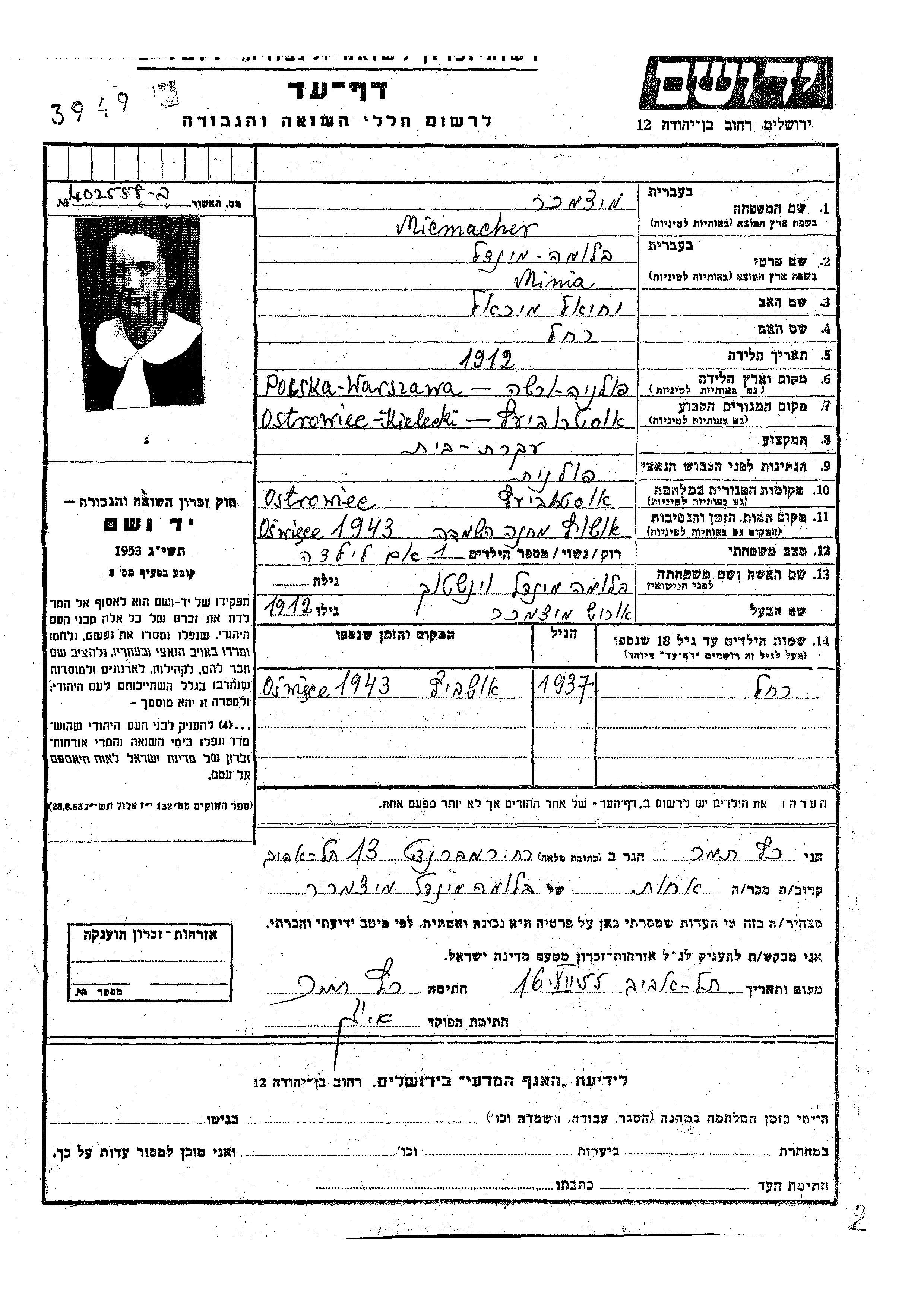 Micmacher Rakhel 1937 Ostrowiec, Pologne Feuille de témoignage