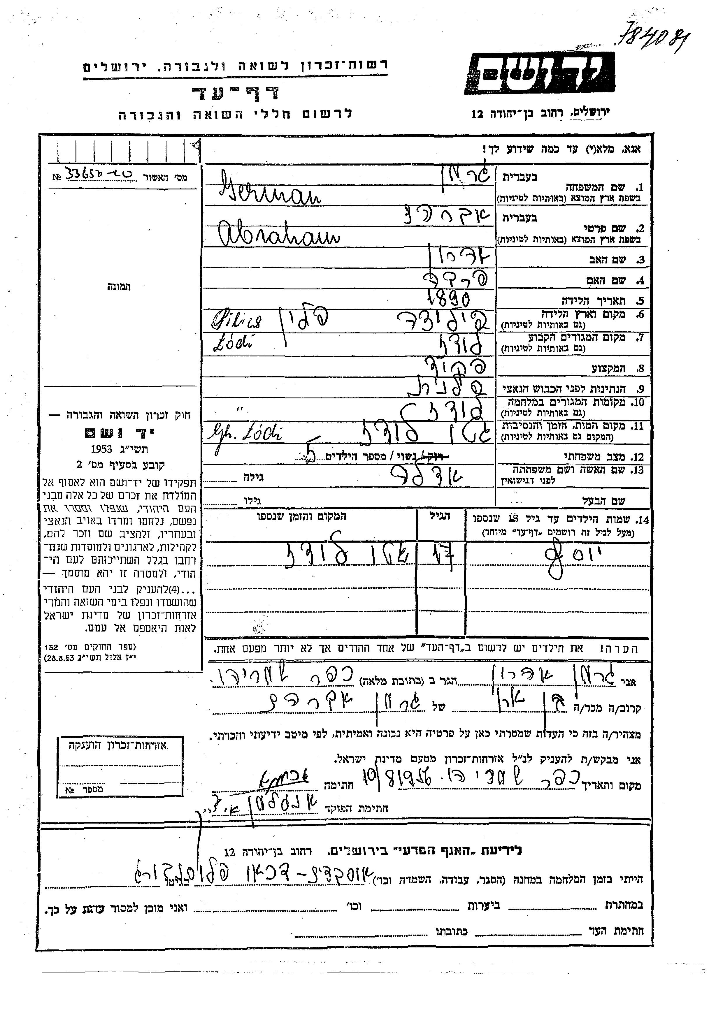 German Yosef Lodz, Pologne Feuille de témoignage