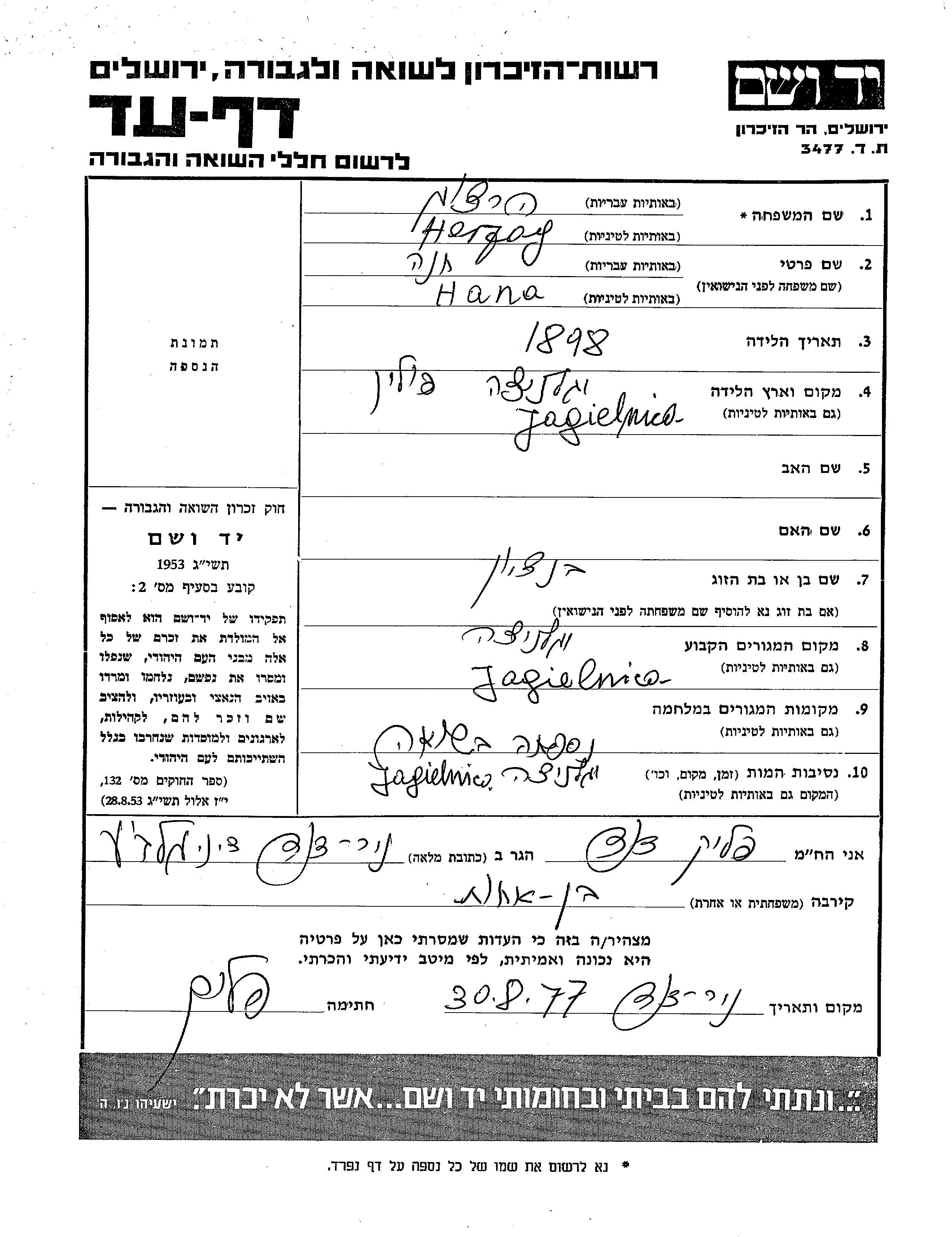 Hana Herzog est née à Jagielnica, Pologne en 1898. Avant la seconde guerre mondiale elle vivait à Jagielnica, Pologne.