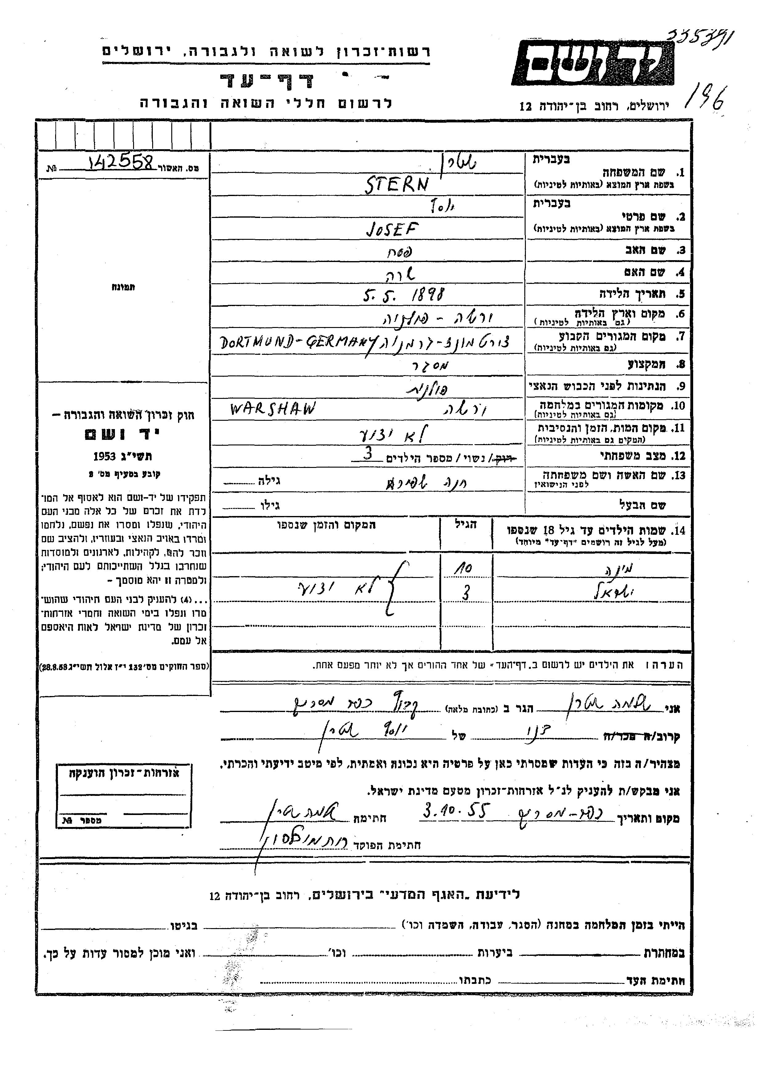 Mina Stern est né/e fils/fille de Josef et de Khana née Shapira. Il/elle était Enfant. Avant la seconde guerre mondiale vivait à Dortmund, Allemagne. Au cours de la guerre elle était à Varsha, Pologne.