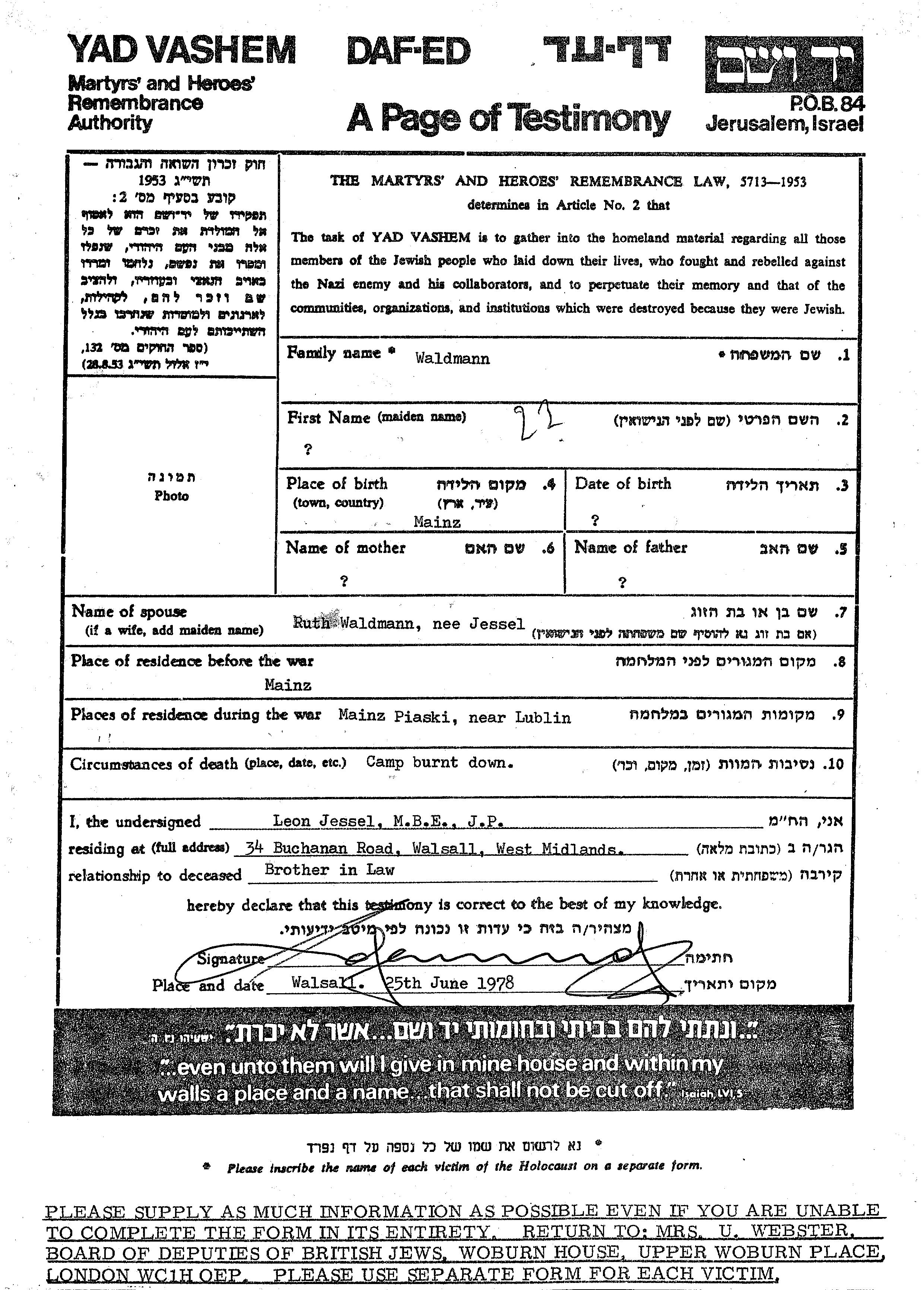 Waldmann prénom inconnu Mainz, Allemagne Feuille de témoignage