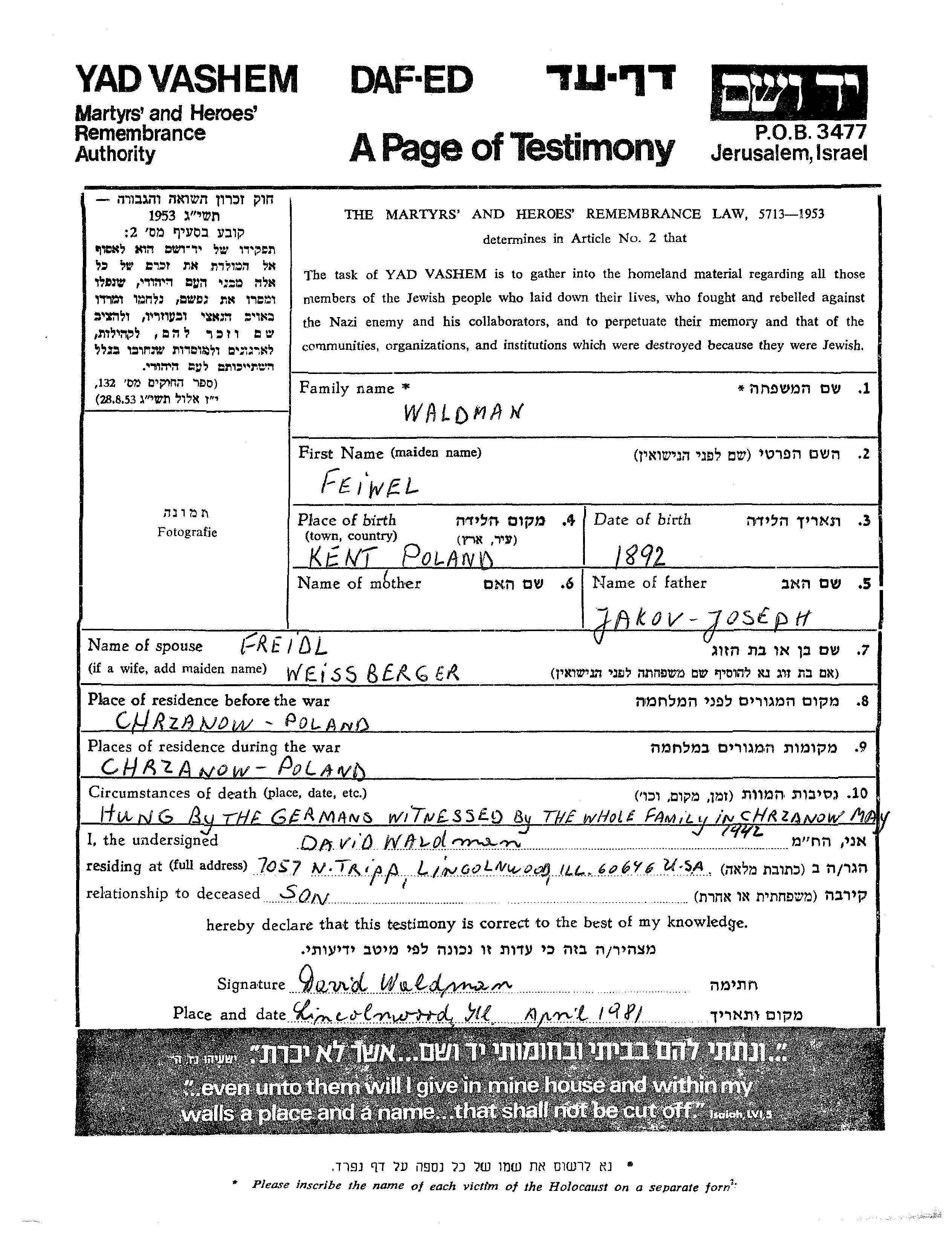 Feiwel Waldman est né à Kenti, Pologne en 1892, fils de Jakov Joseph. Avant la seconde guerre mondiale il vivait à Chrzanow, Pologne. Au cours de la guerre, il était à Chrzanow, Pologne.