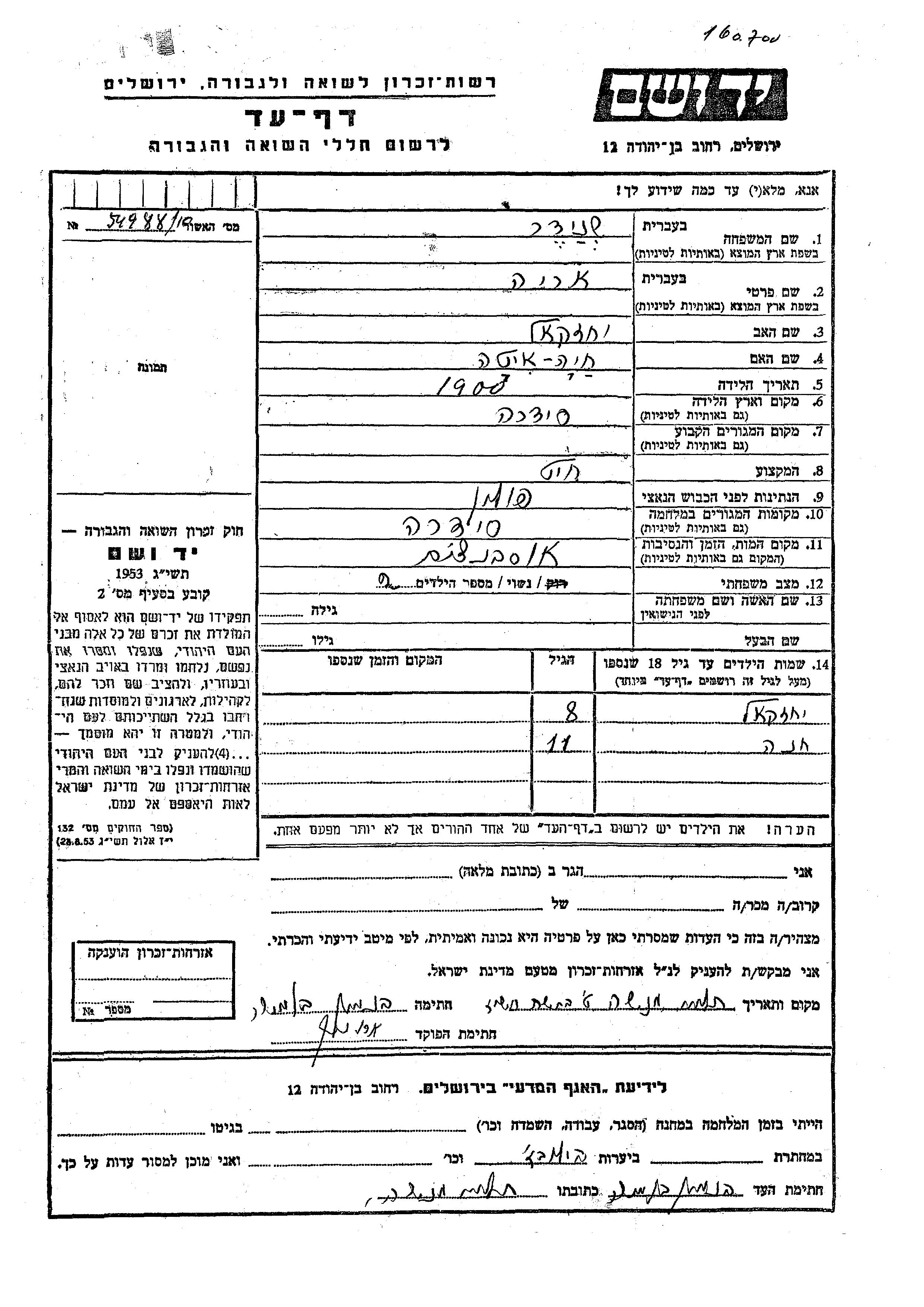 Yad Vashem - Pages of Testimony Names Memorial Collection