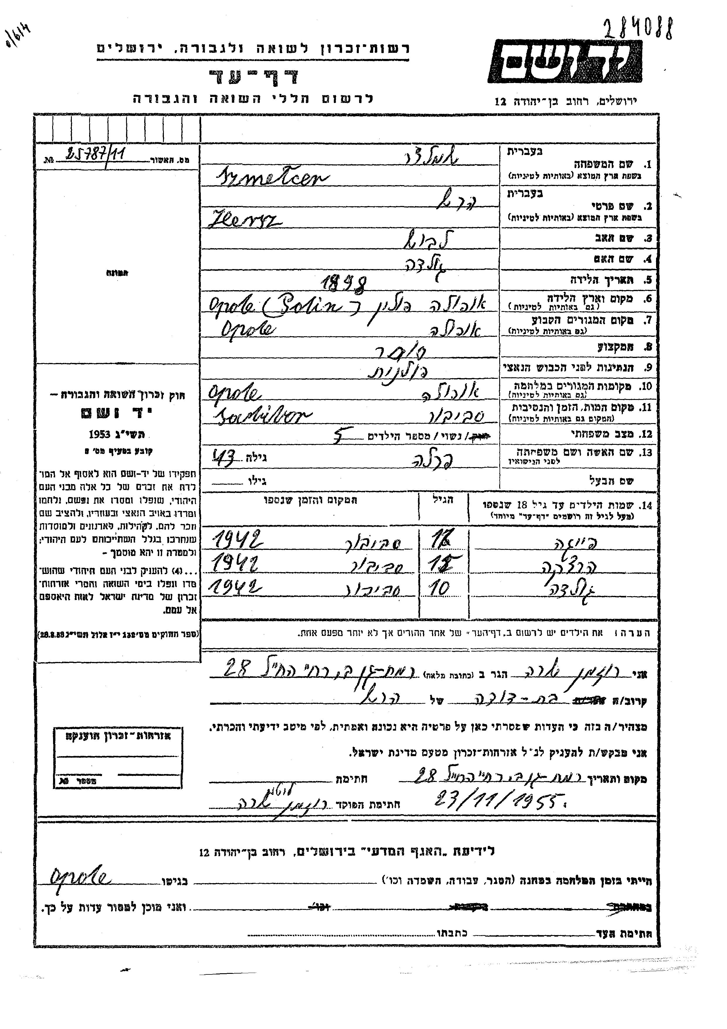 Szmelcer Feiga Opole, Pologne Feuille de témoignage