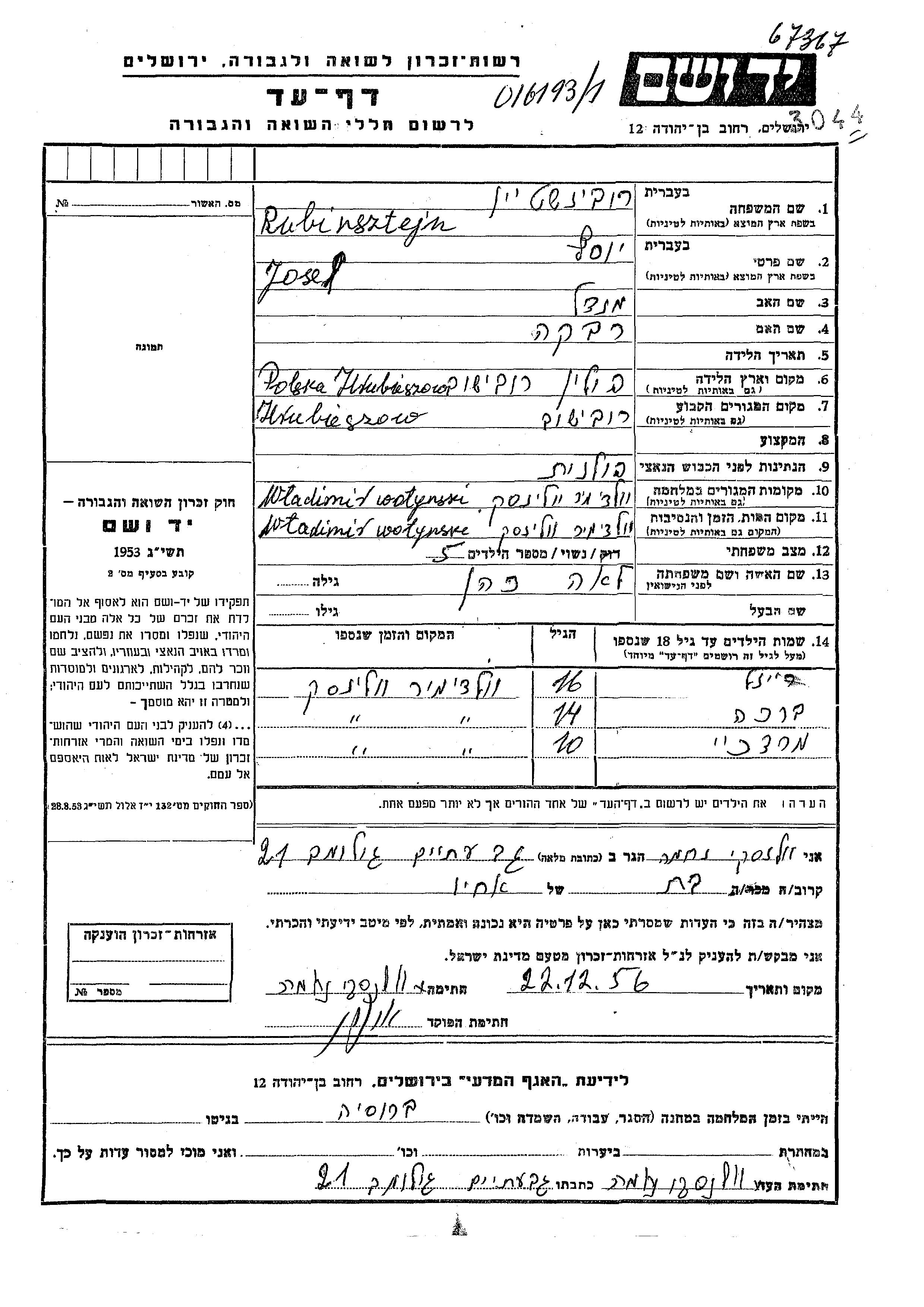 Reizl Rubinsztejn est née fille de Josef et de Lea née Kohen. Elle était Enfant. Avant la seconde guerre mondiale elle vivait à Hrubieszow, Pologne. Pendant la guerre, elle était à Wladimir Wolynski, Pologne.