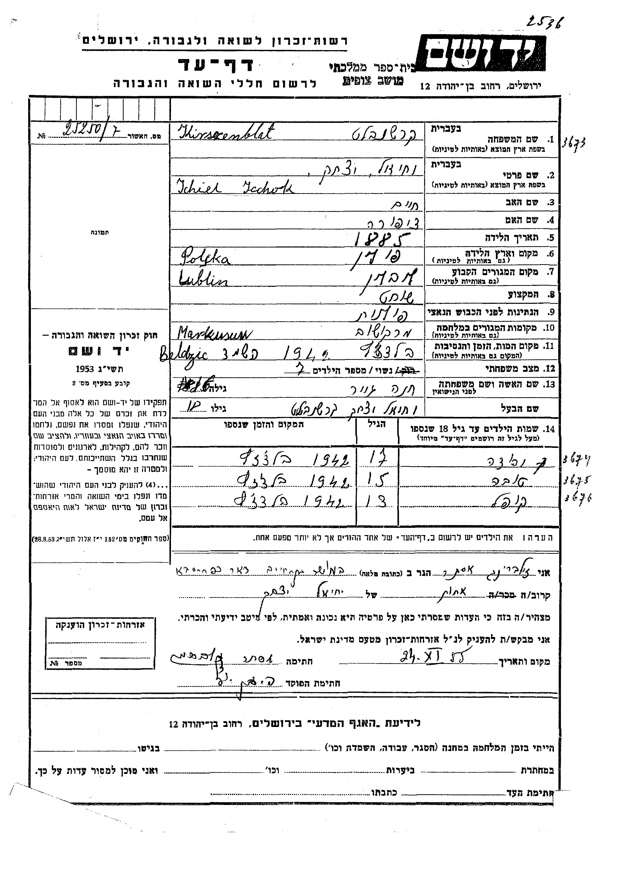 Kirszenblat Tova Lublin, Pologne Feuille de témoignage