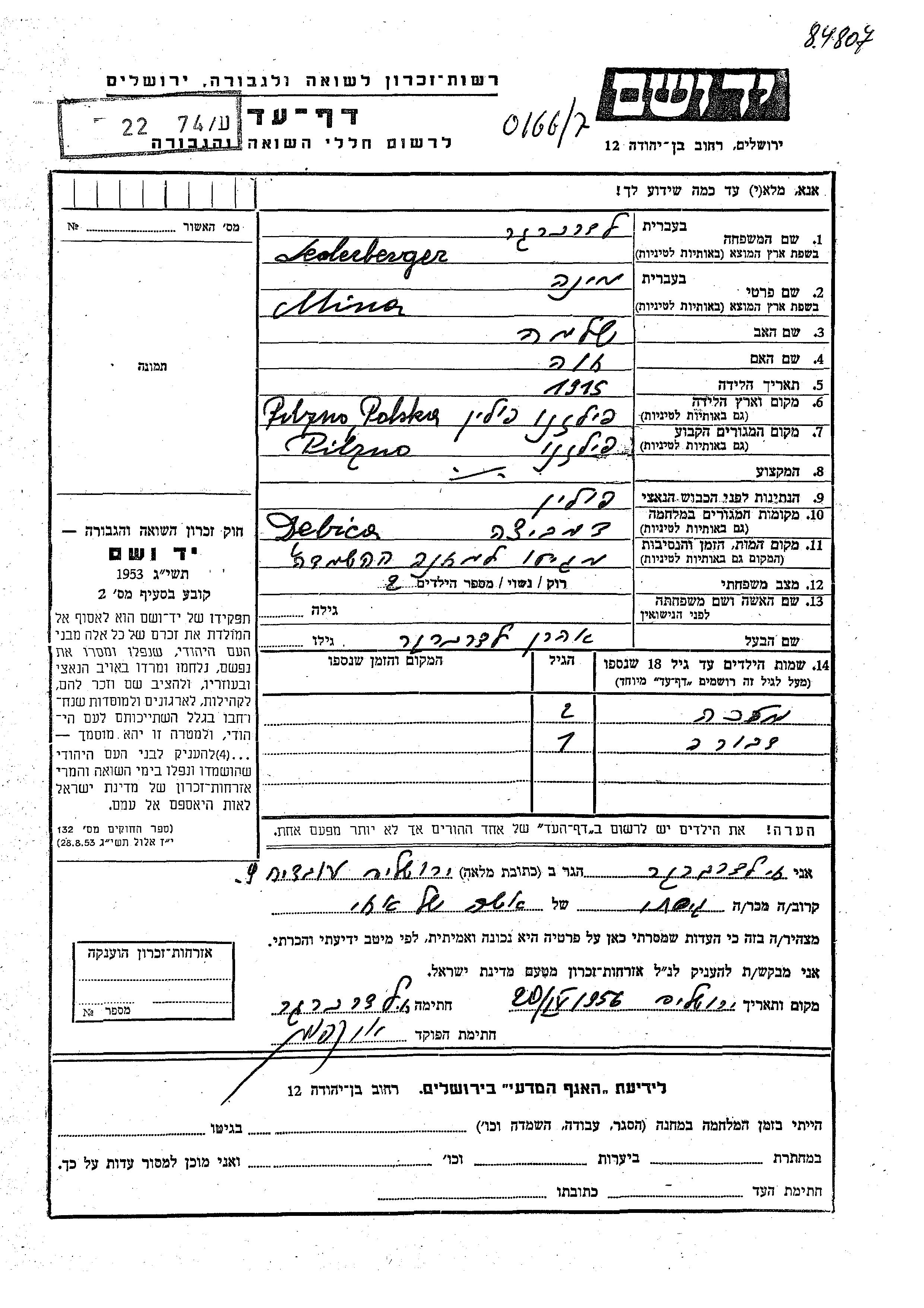 Lederberger Dvora Pilzno, Pologne Feuille de témoignage