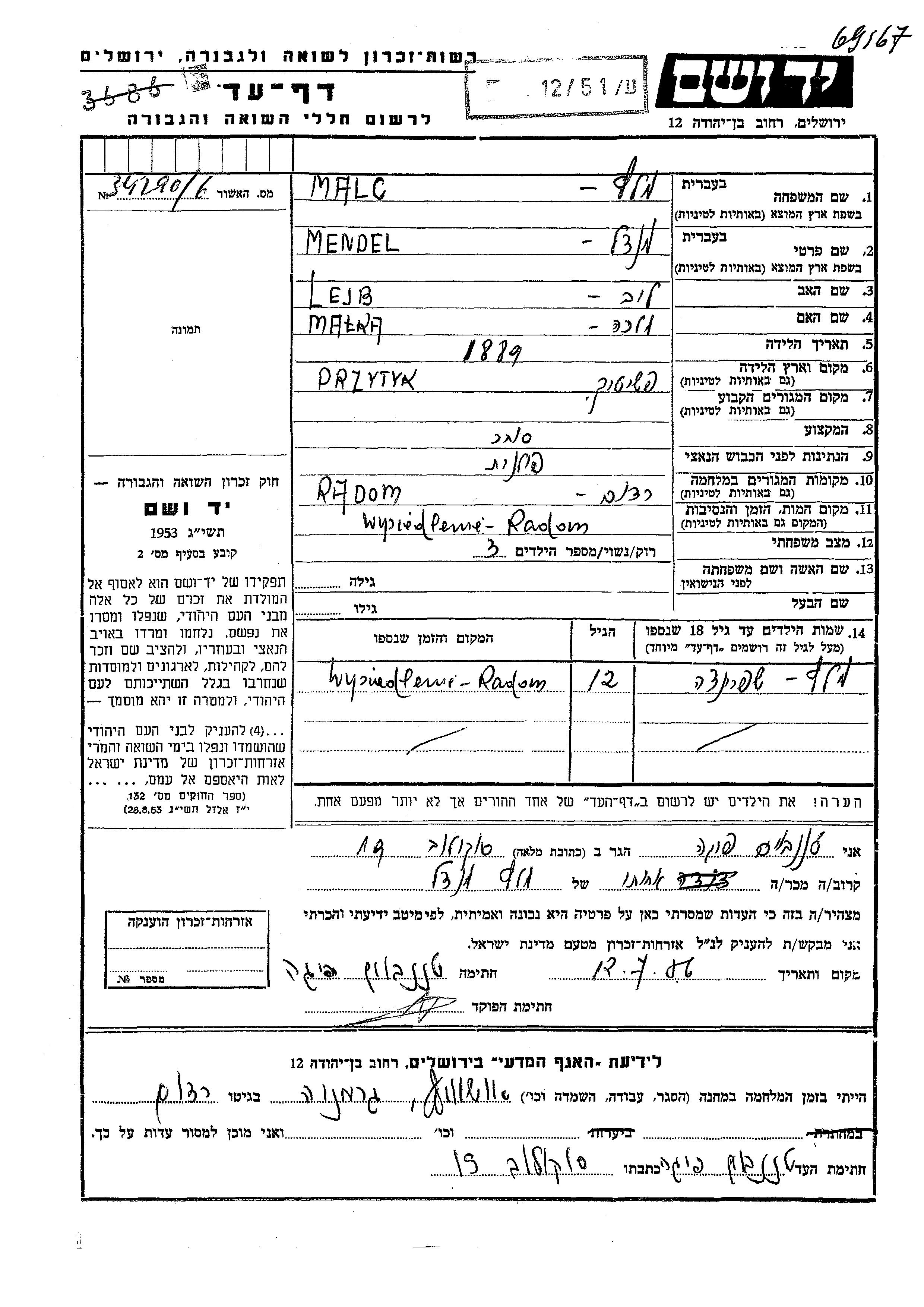 Yad Vashem - Pages of Testimony Names Memorial Collection