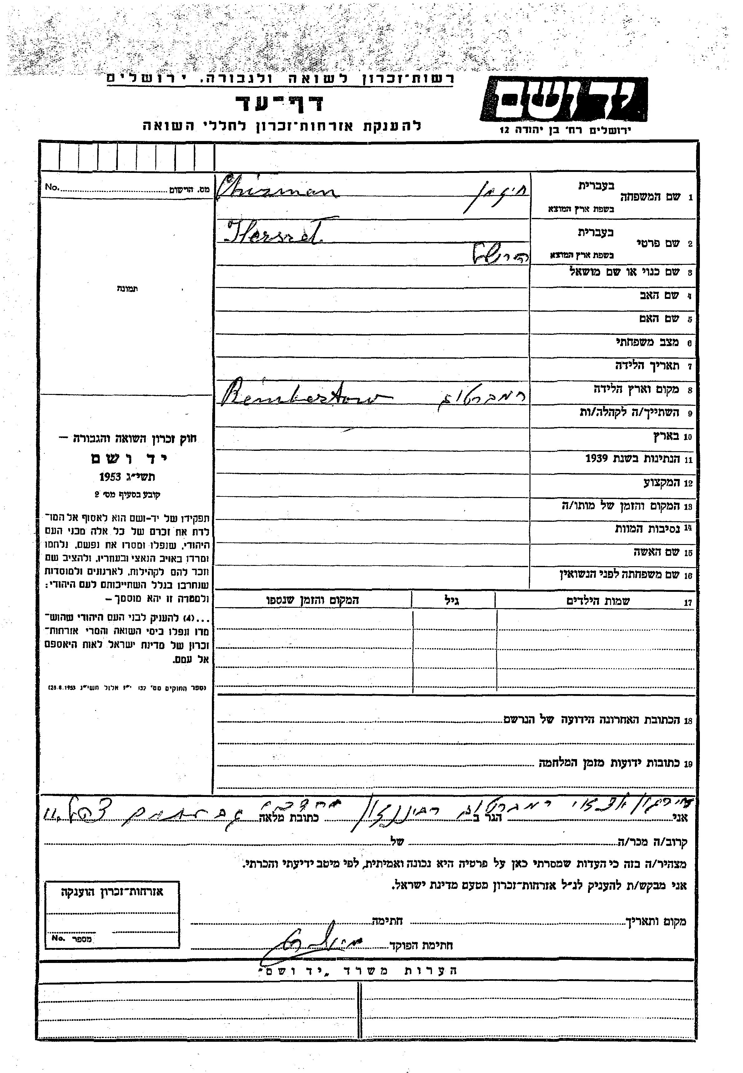 Chizman Herszel Rembertow, Pologne Feuille de témoignage