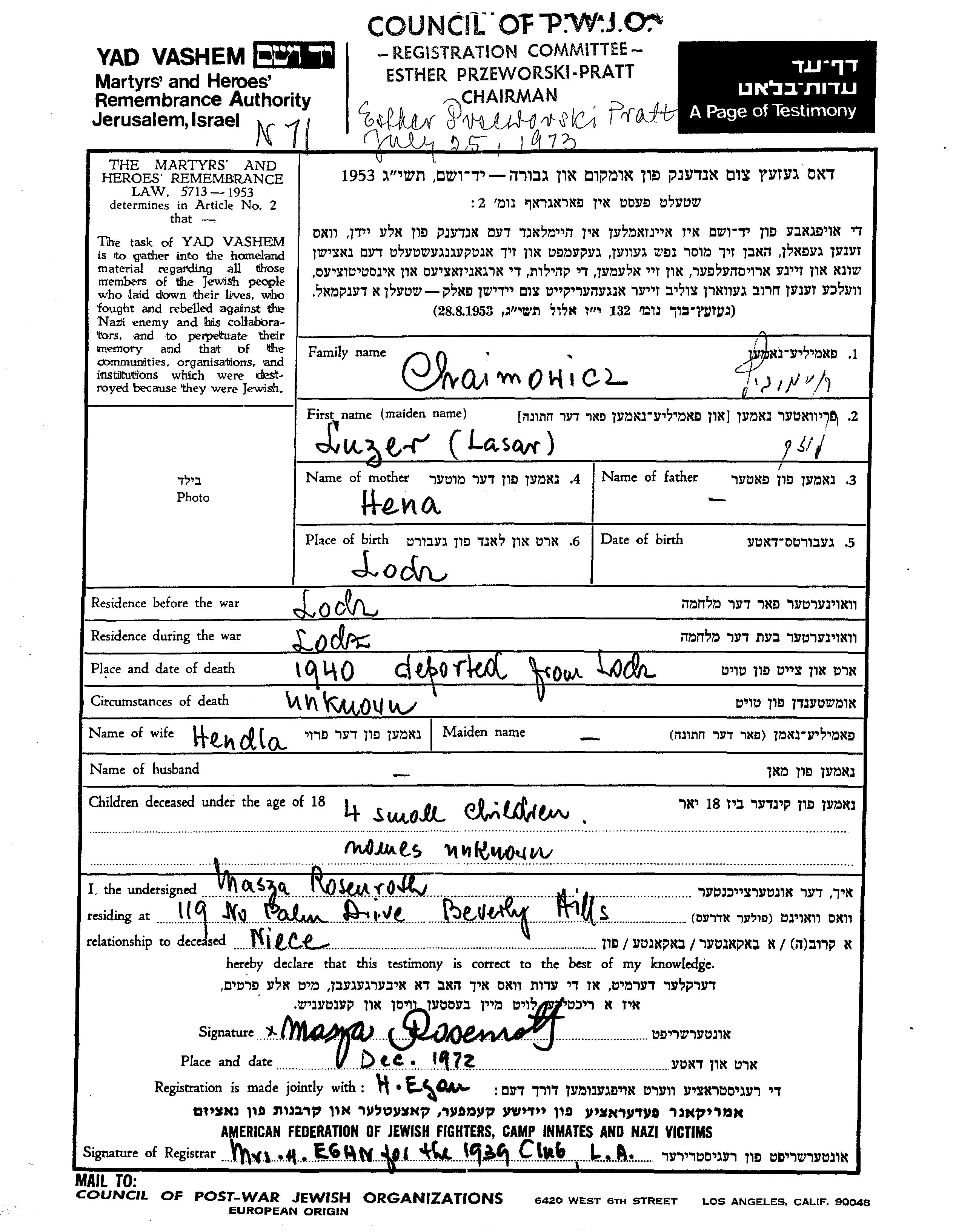 Luzer Chaimowicz est né à Lodz, Pologne, fils de Hena. Il était Mariée à Hendla. Avant la seconde guerre mondiale il vivait à Lodz, Pologne. Au cours de la guerre, il était à Lodz, Pologne.