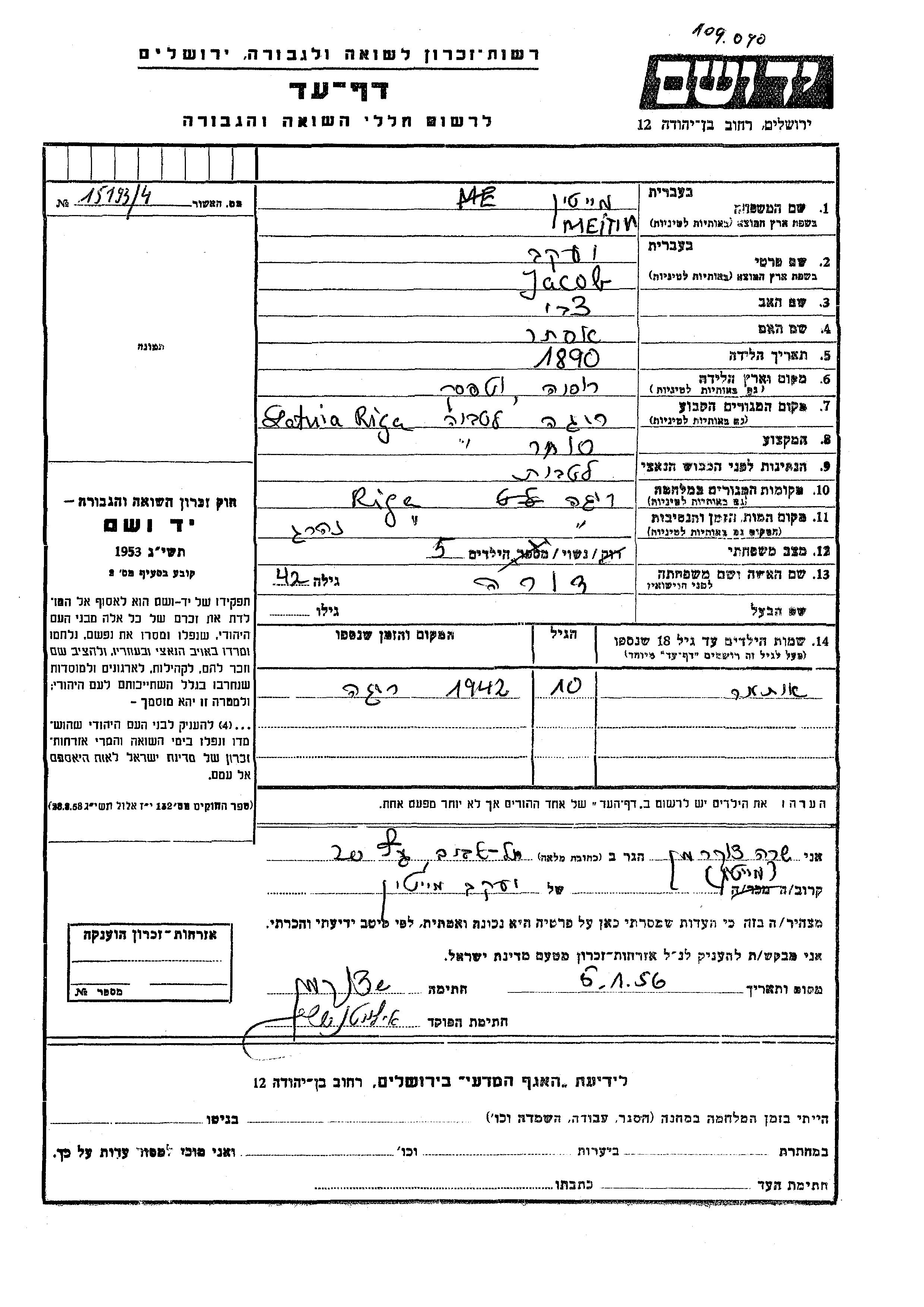 Meitin Itamar Riga, Lettonie Feuille de témoignage