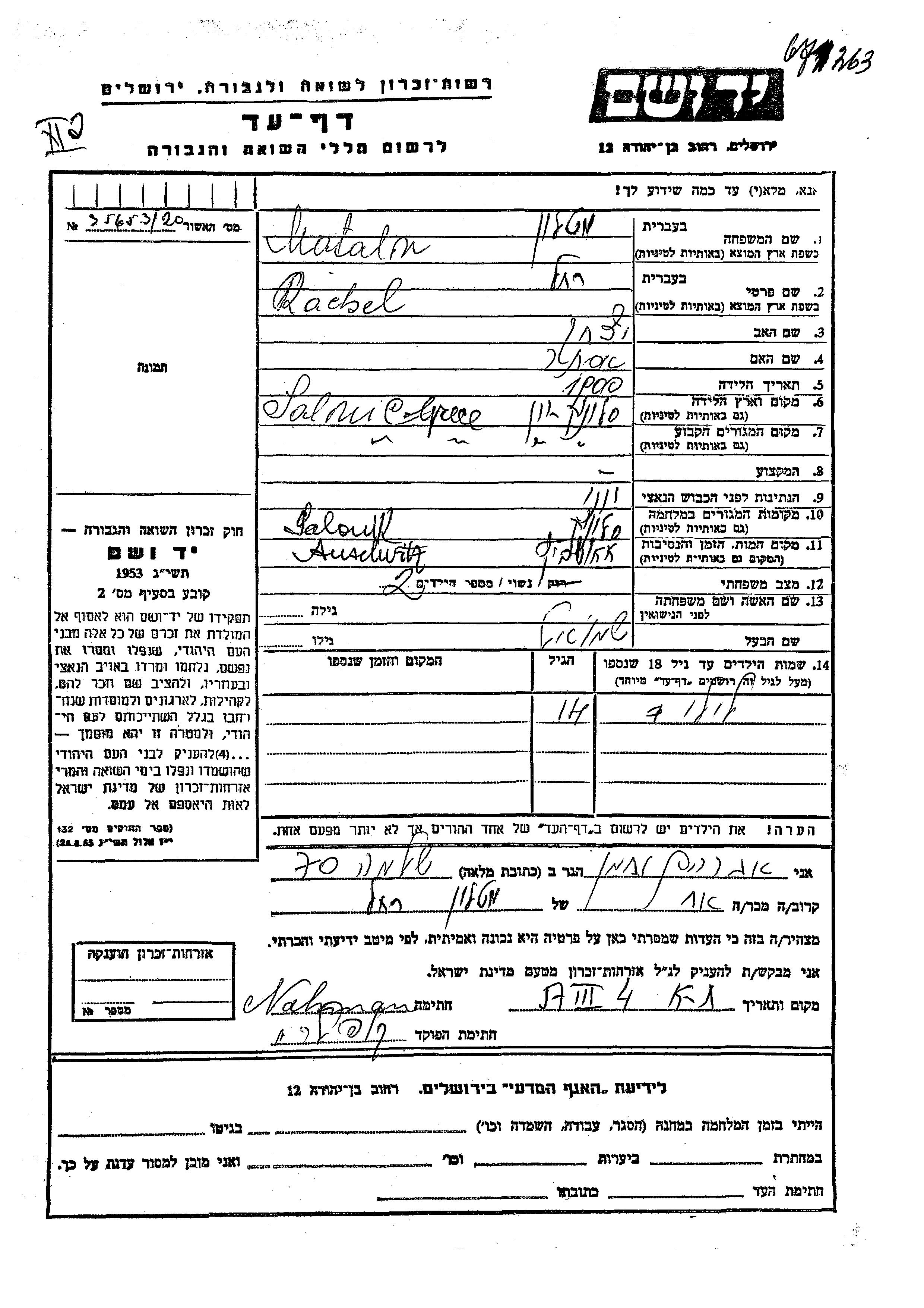 Matalon Lili Saloniki, Grèce Feuille de témoignage