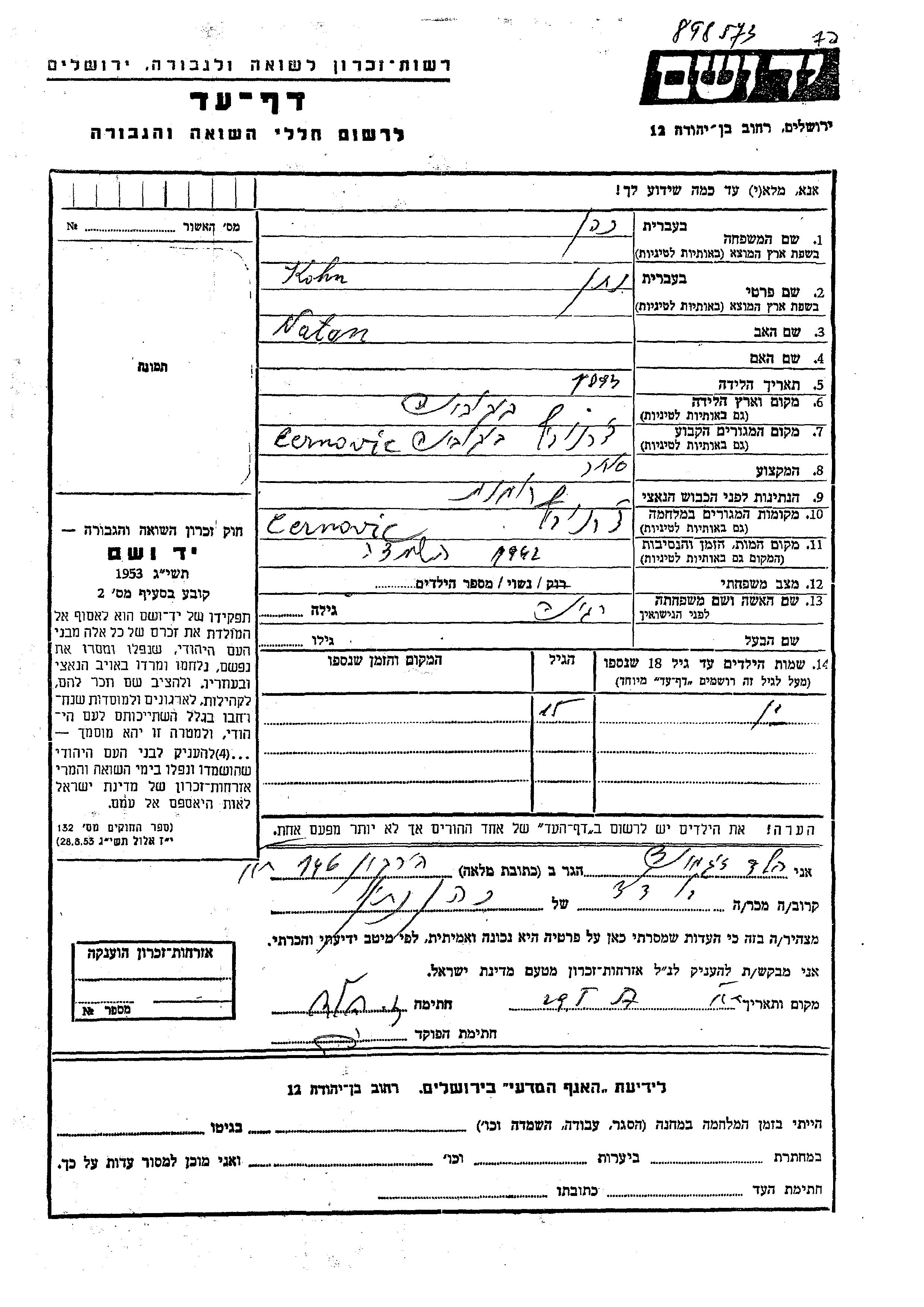 Kohn Yan Czernowitz, Roumanie Feuille de témoignage
