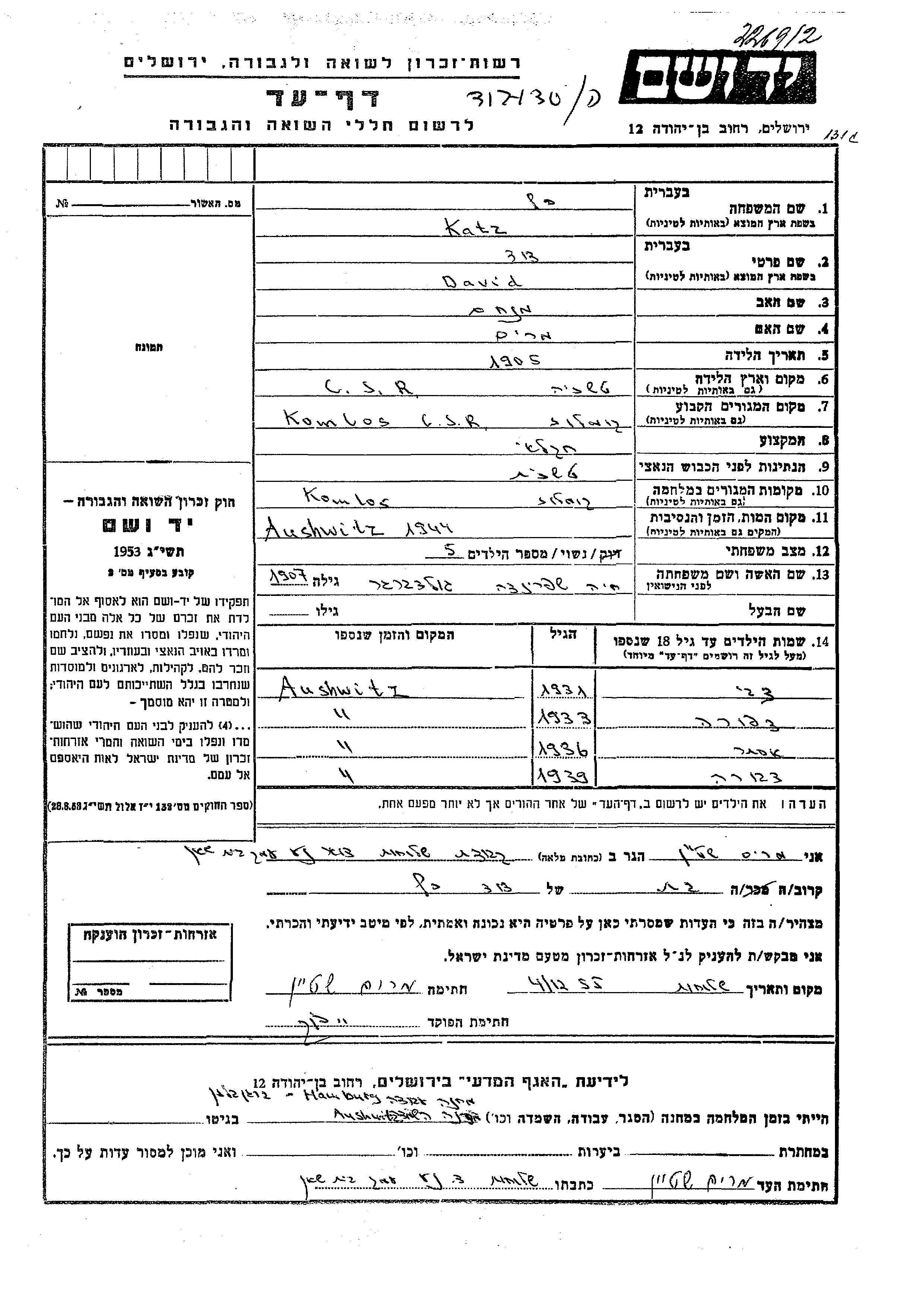 Katz Dvora 1939 Komlos, Tchécoslovaquie Feuille de témoignage