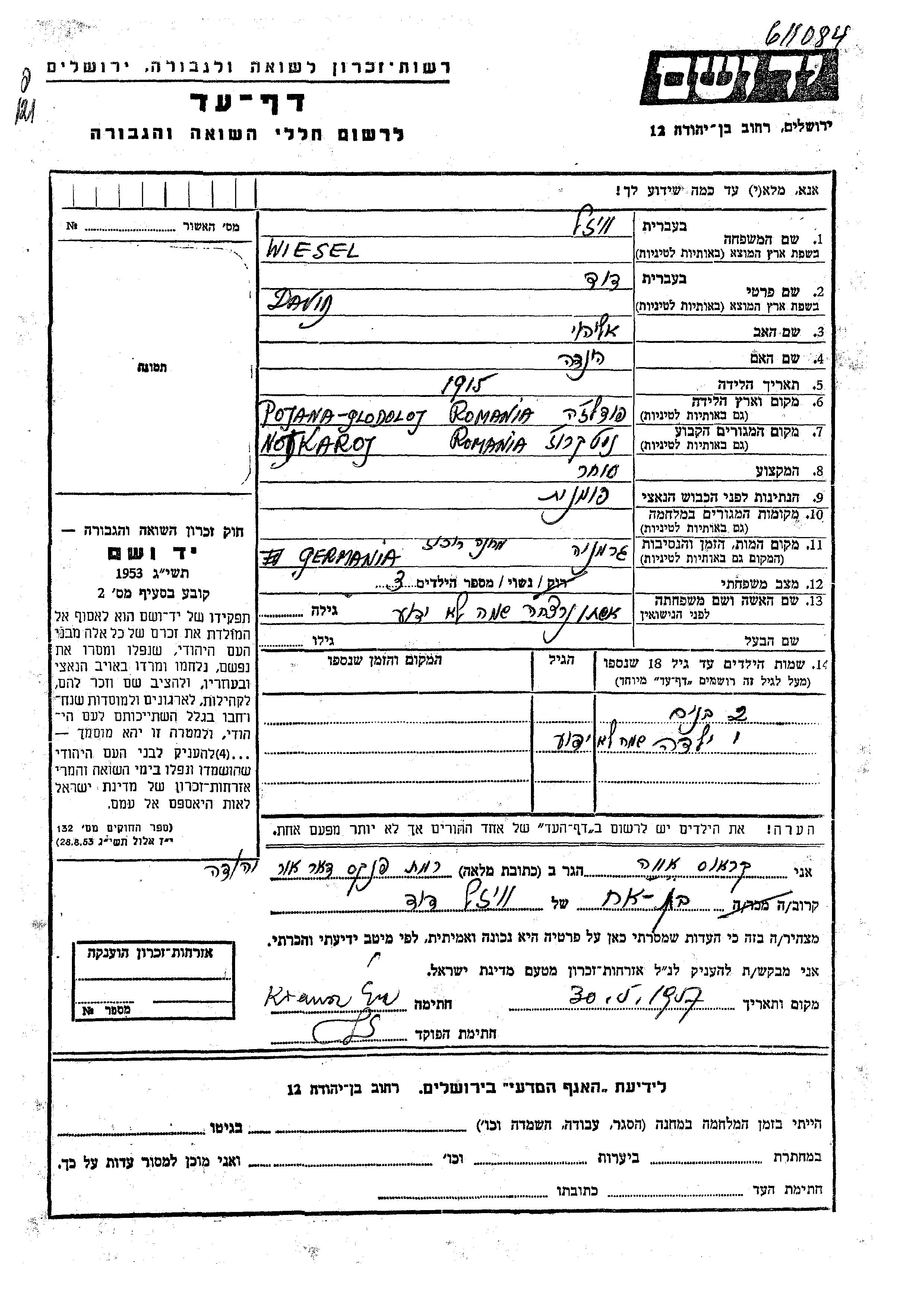 Wiesel David 1915 Notkaroi, Roumanie Feuille de témoignage