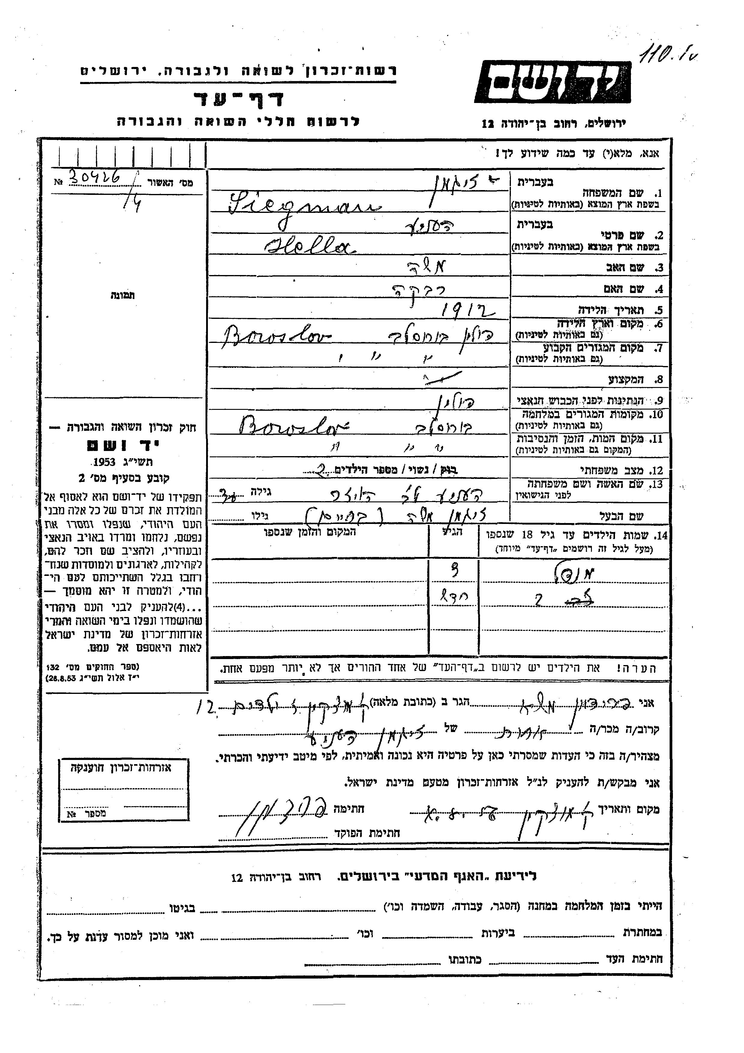 Siegman Mendel Borislav, Pologne Feuille de témoignage