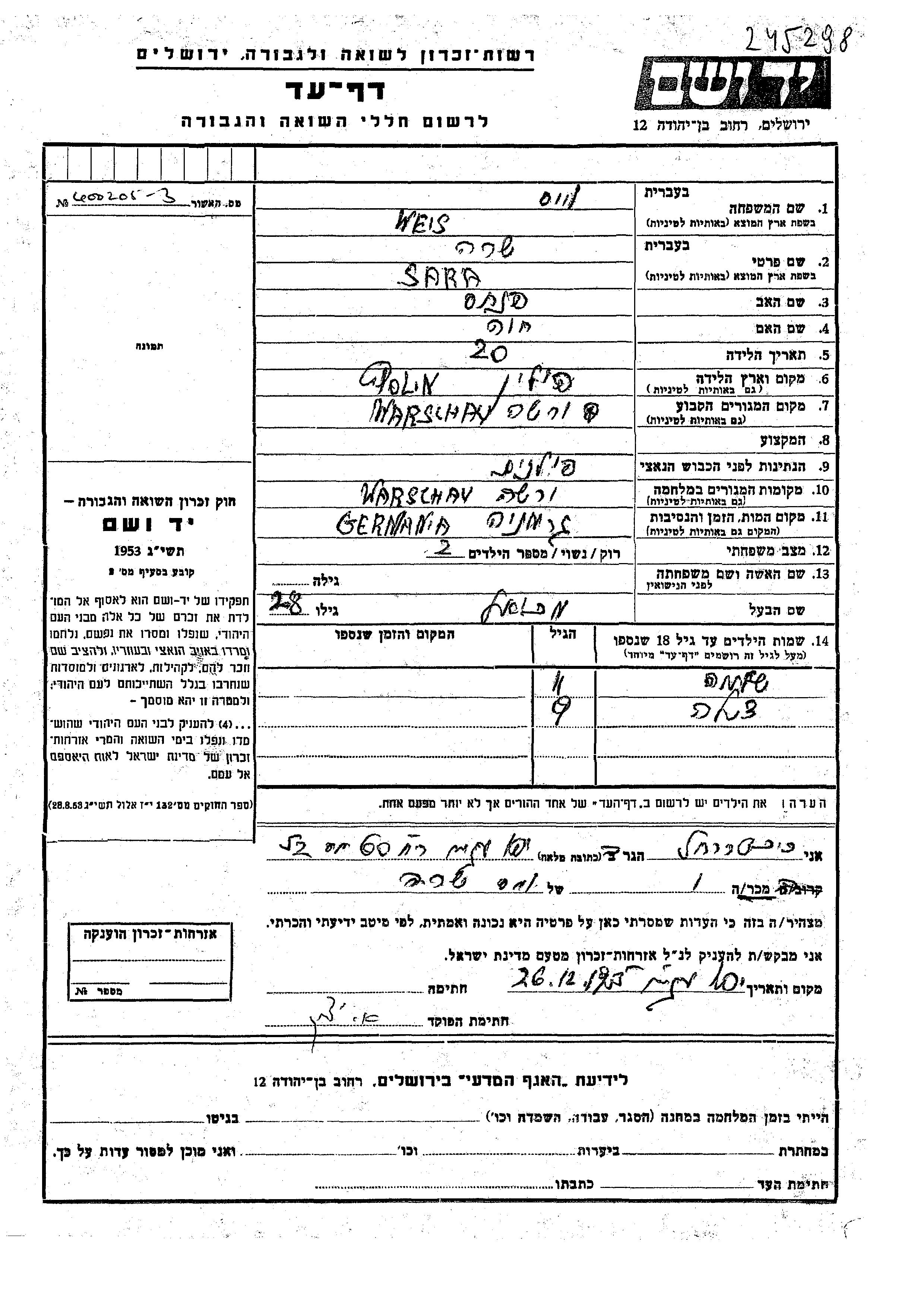 Weis Shlomo Warsaw, Pologne Feuille de témoignage