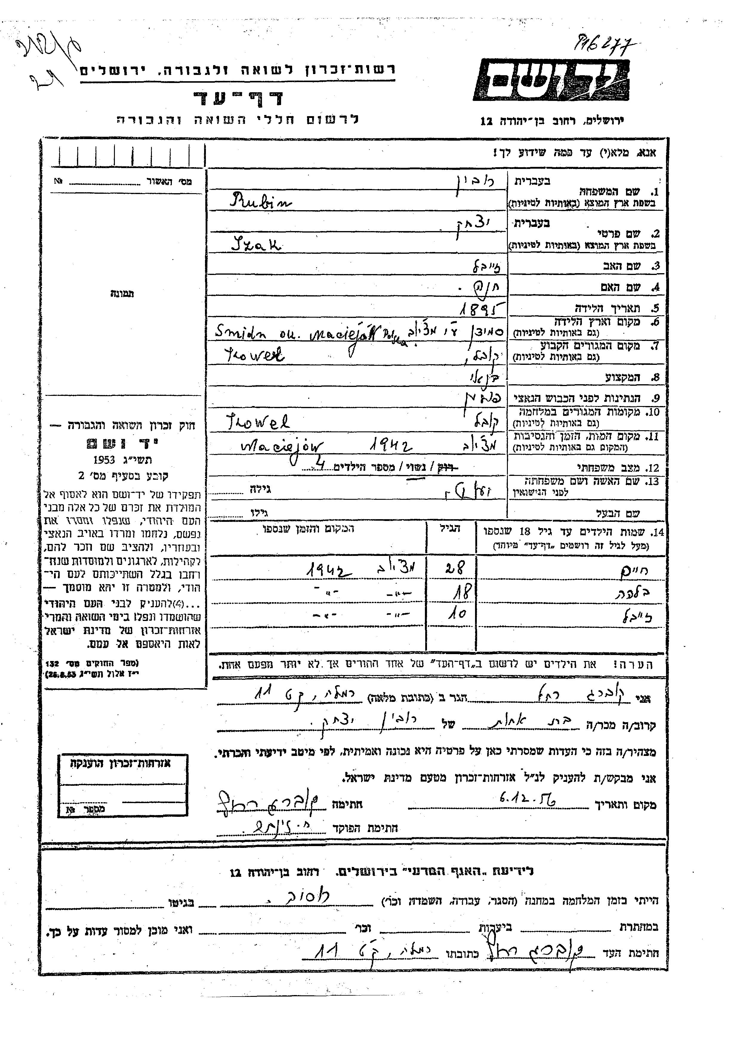Rubin Khaim Kowel, Pologne Feuille de témoignage