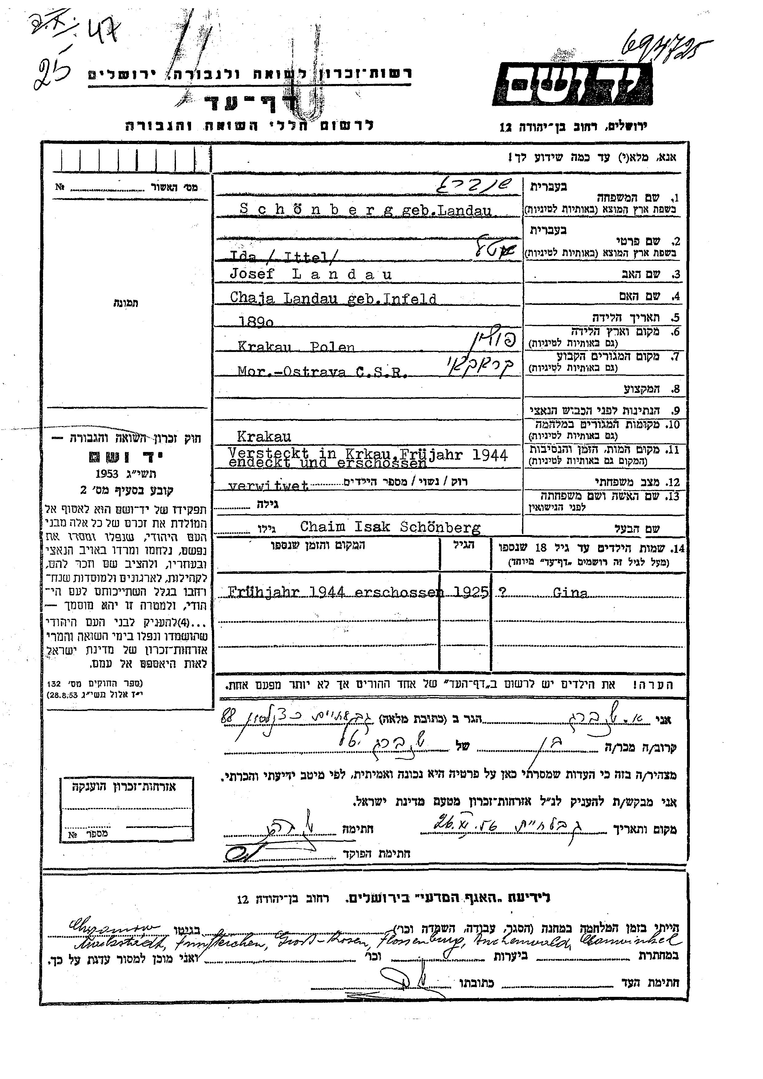 Gina Schonberg est née en 1925, fille de Chaim Isaak et de Ida Itel née Landau. Elle était Enfant. Avant la seconde guerre mondiale elle vivait à Ostrava, Tchécoslovaquie. Pendant la guerre, elle était à Krakow, Pologne.