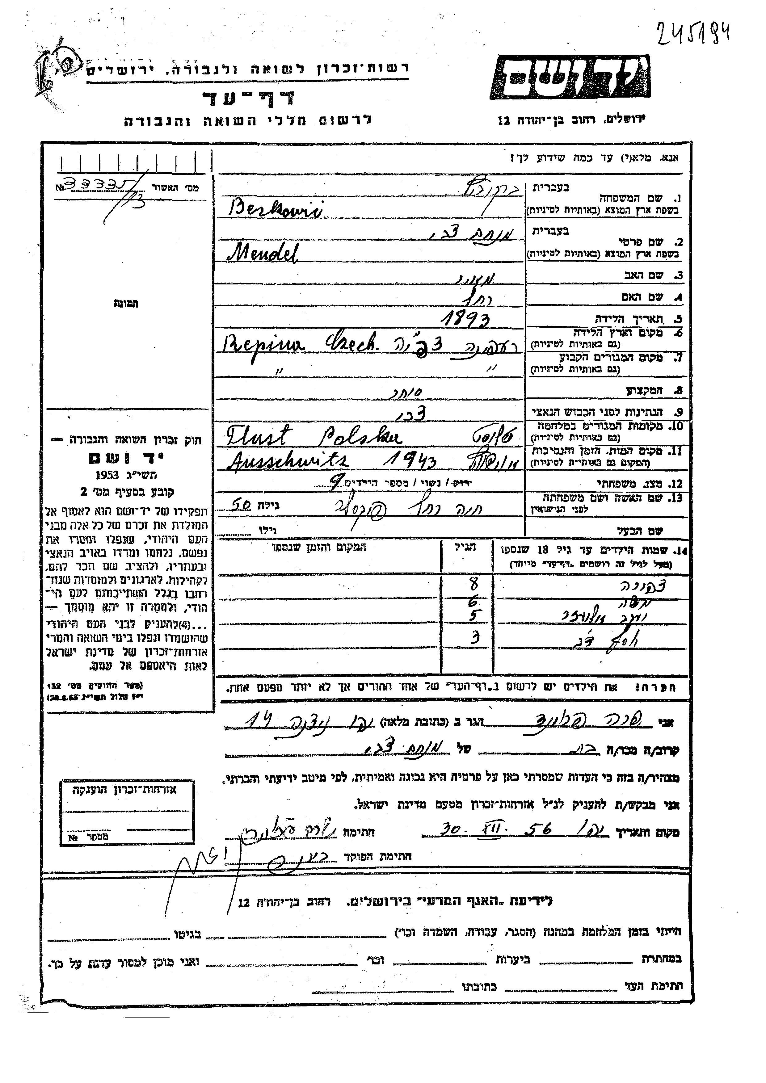 Berkowicz Yosef Dov Repina, Tchécoslovaquie Feuille de témoignage