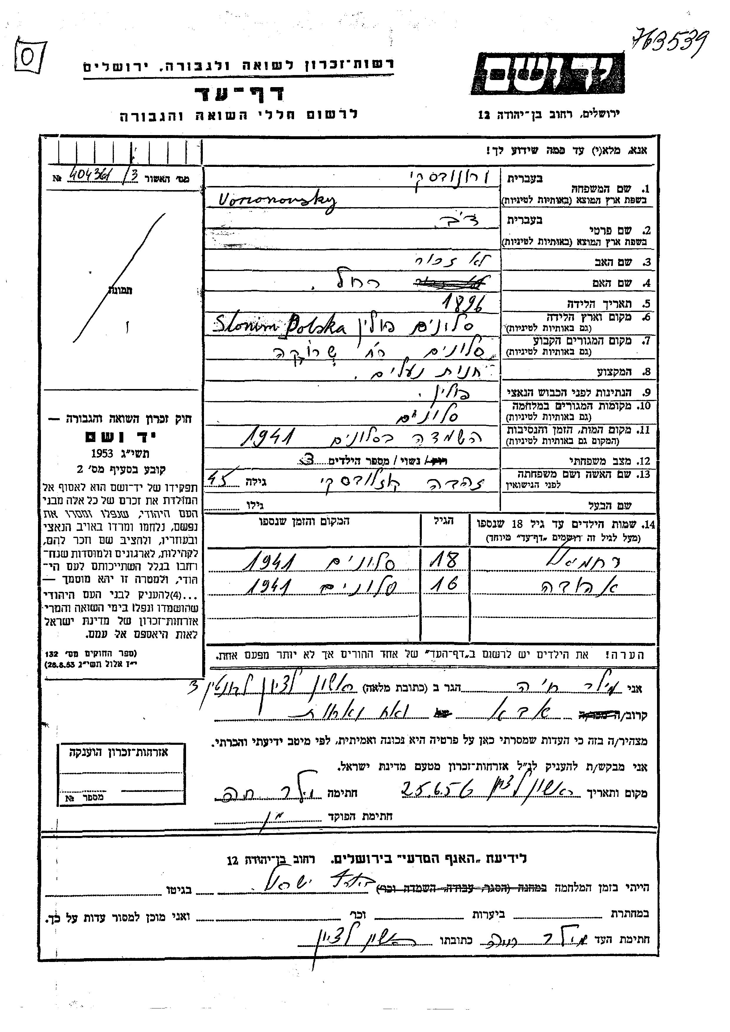 Voronovsky Vronovski Ahuva Slonim, Pologne Feuille de témoignage