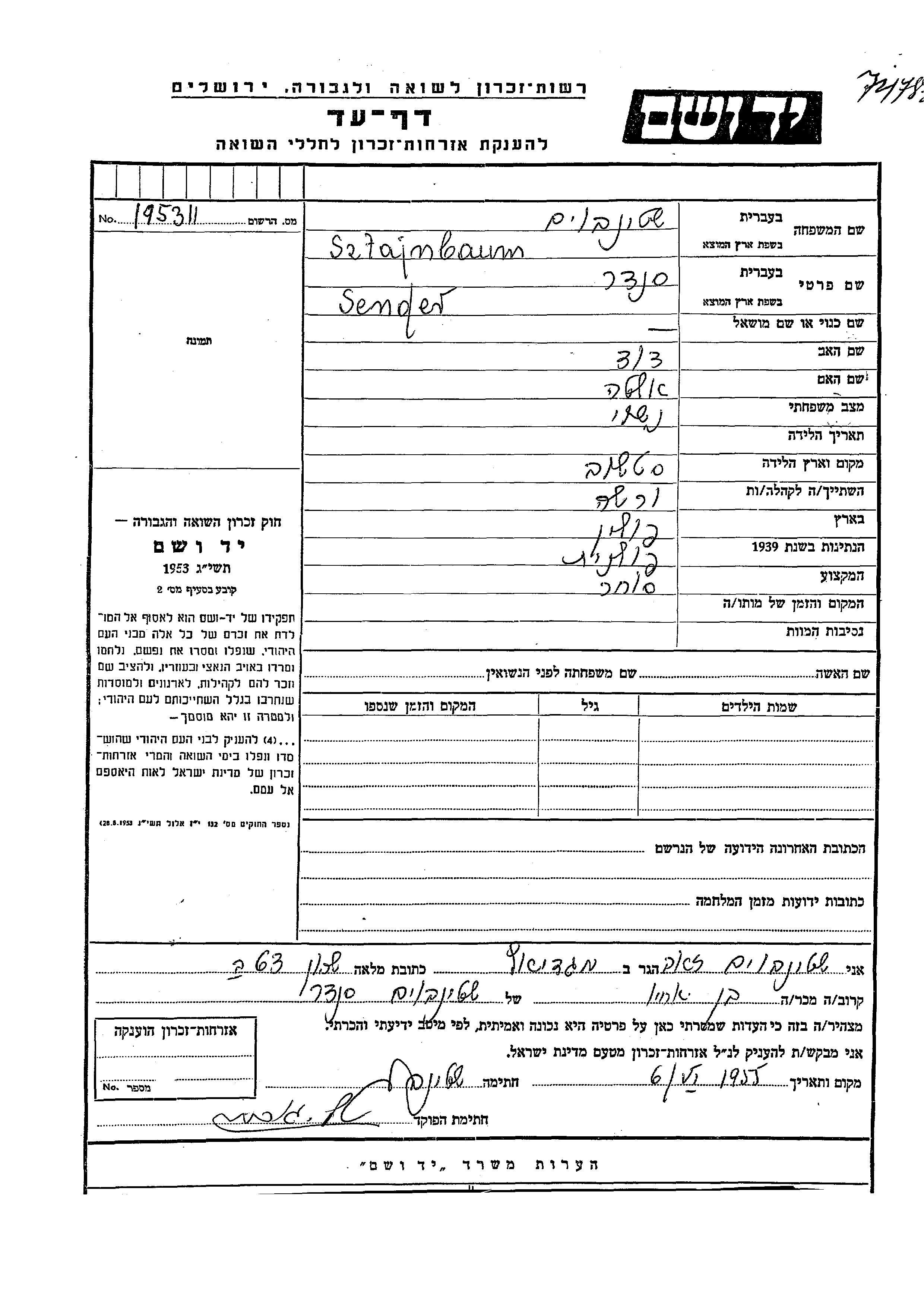 Sztajnbaum Sender Warszawa, Pologne Feuille de témoignage