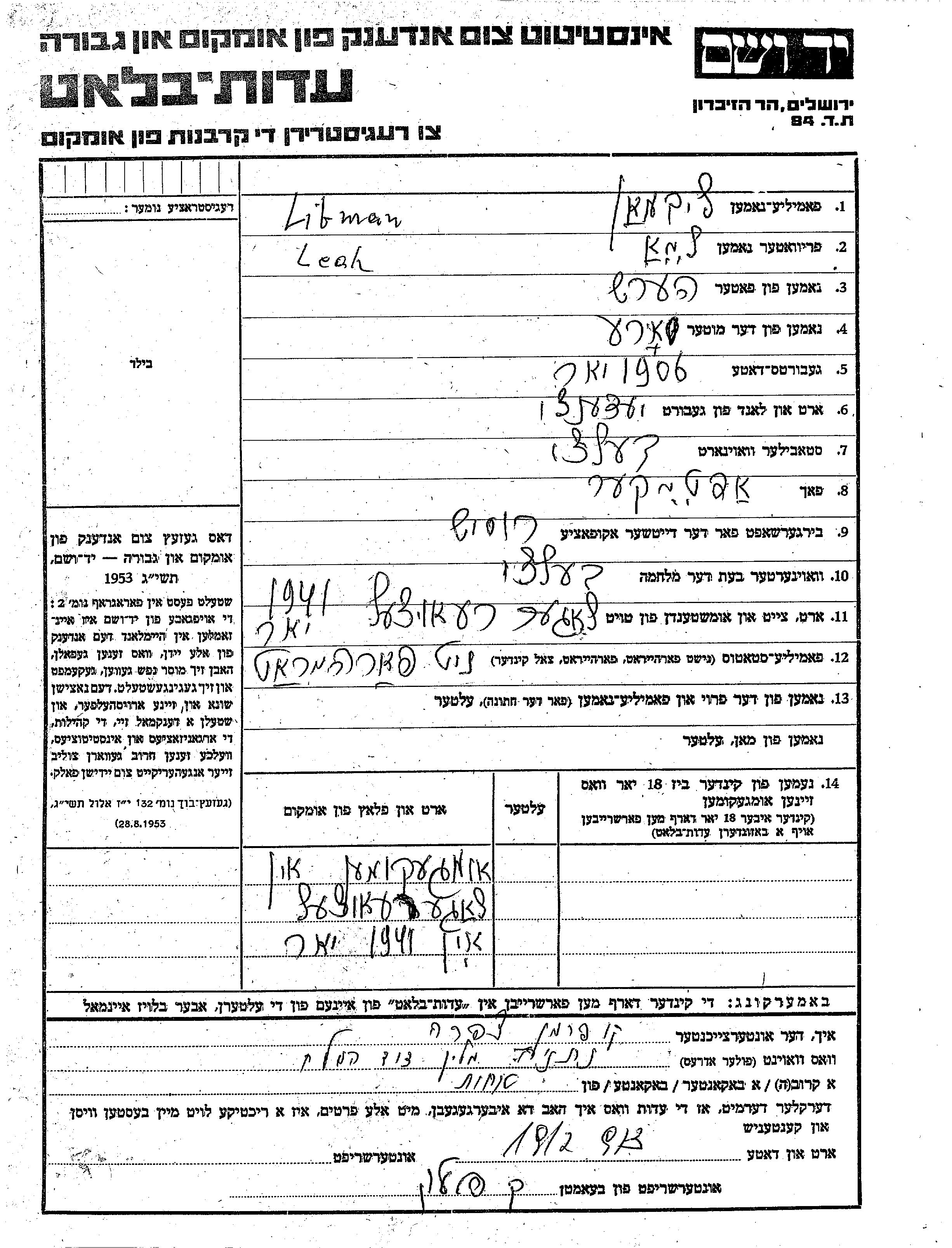 Libman Leah 1906 Kielce, Pologne Feuille de témoignage