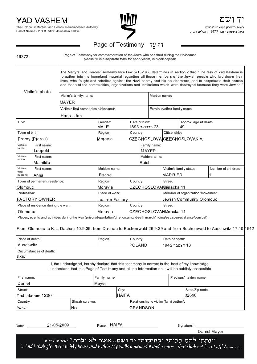 Hans Jan Mayer est né à Prerov, Tchécoslovaquie en 1893, fils de Leopold et de Mathilde née Reich. Il était Propriétaire d'usine et Mariée à Anna née Fischel. Avant la seconde guerre mondiale il vivait à Olomouc, Tchécoslovaquie. Au cours de la guerre, il était à Olomouc, Tchécoslovaquie.