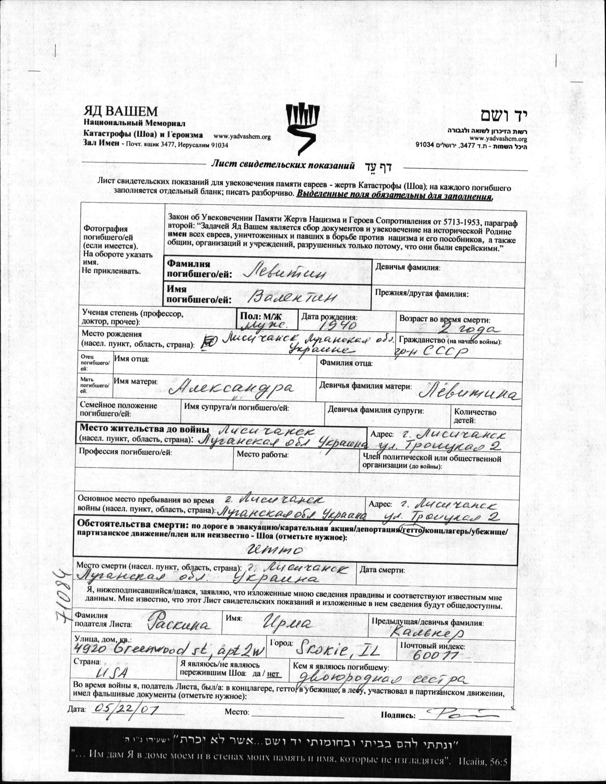 Levitin Valentin 1940 Lisichansk, Ukraine (URSS) Feuille de témoignage