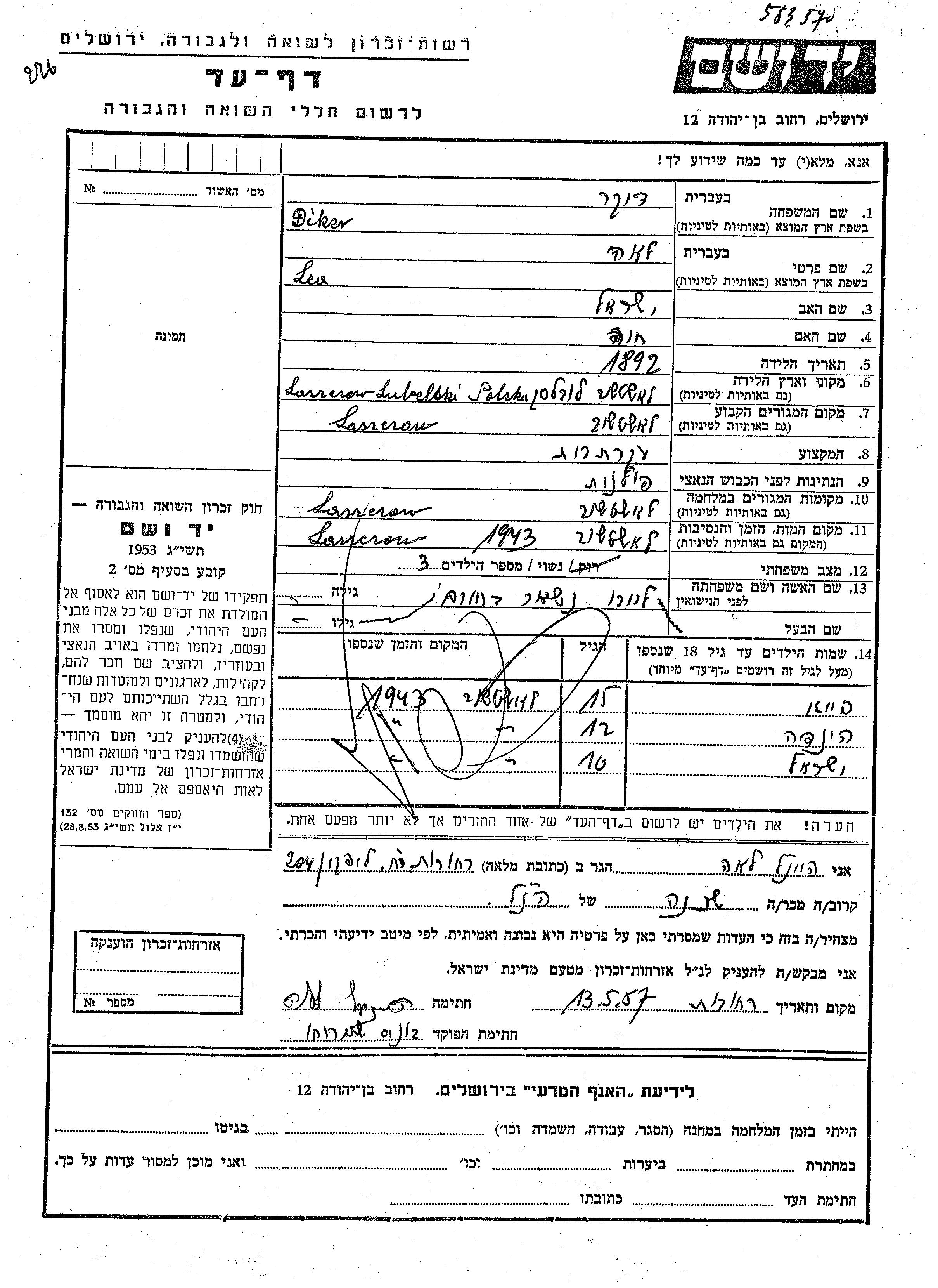 Diker Duker Hinda Laszczow, Pologne Feuille de témoignage