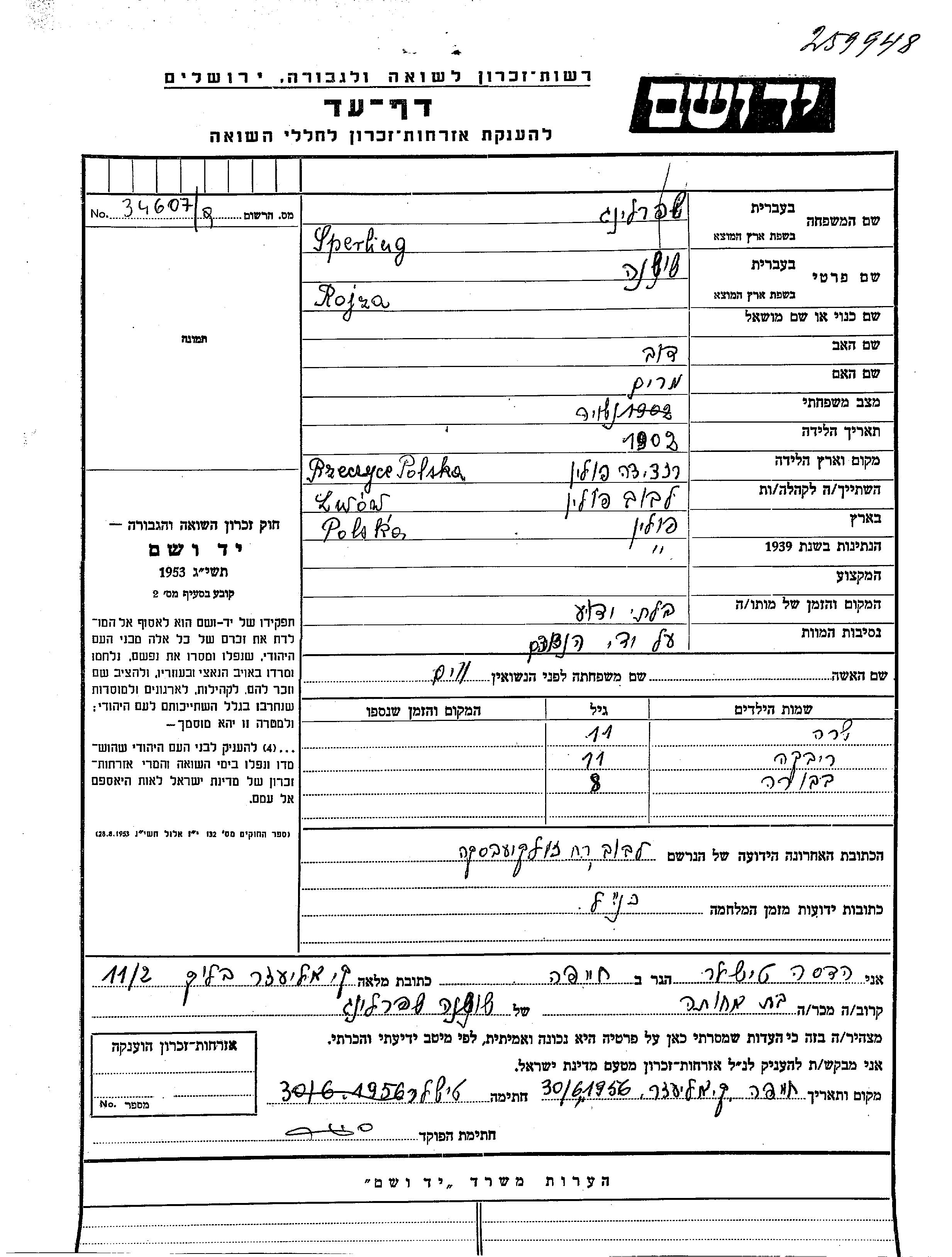 Sperling Sara Lwow, Pologne Feuille de témoignage