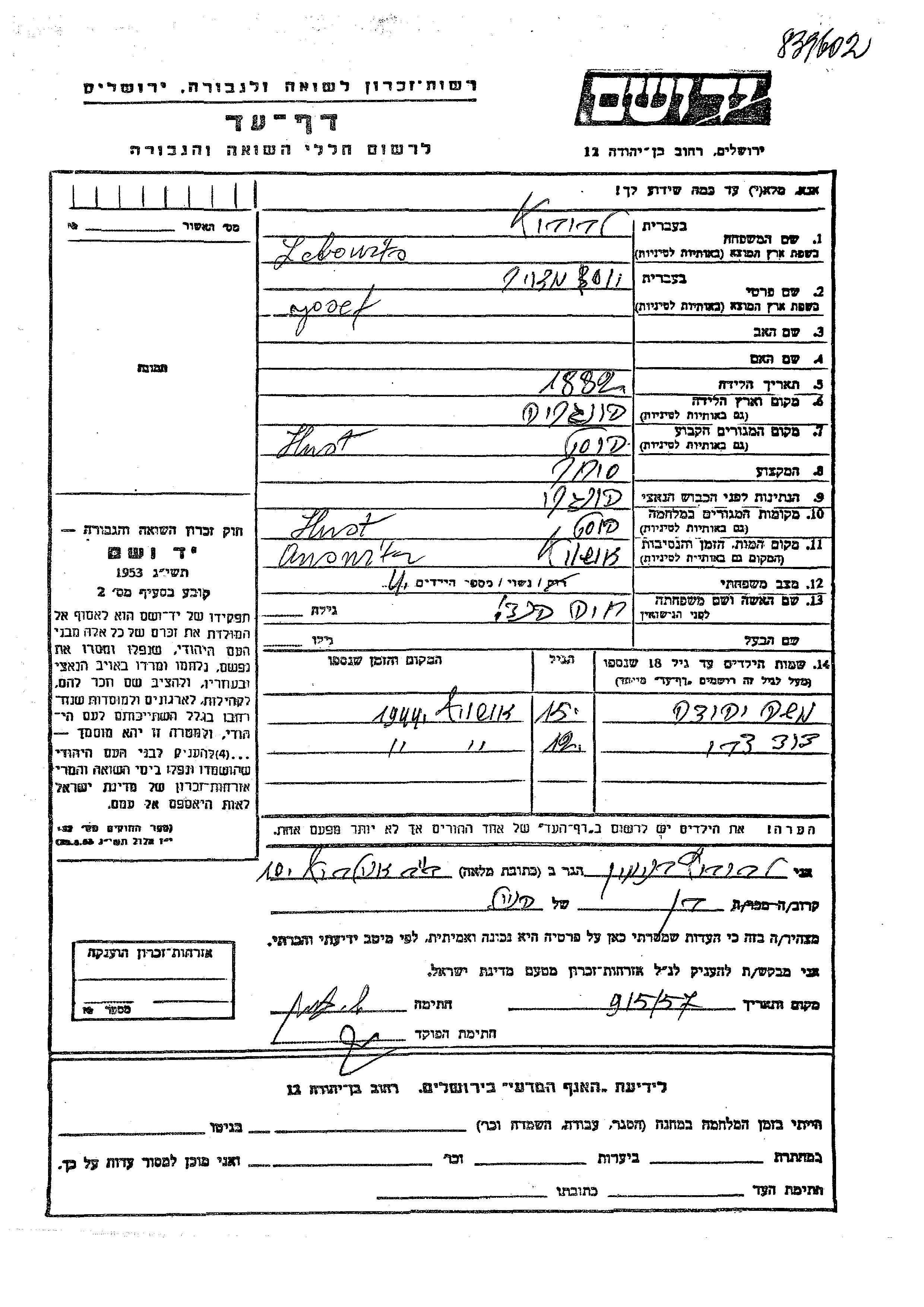 David Tzvi Lebowits est né fils de Yosef Meir et de Khaia A. Il était Enfant. Avant la seconde guerre mondiale il vivait à Hust, Tchécoslovaquie. Au cours de la guerre, il était à Hust, Tchécoslovaquie.