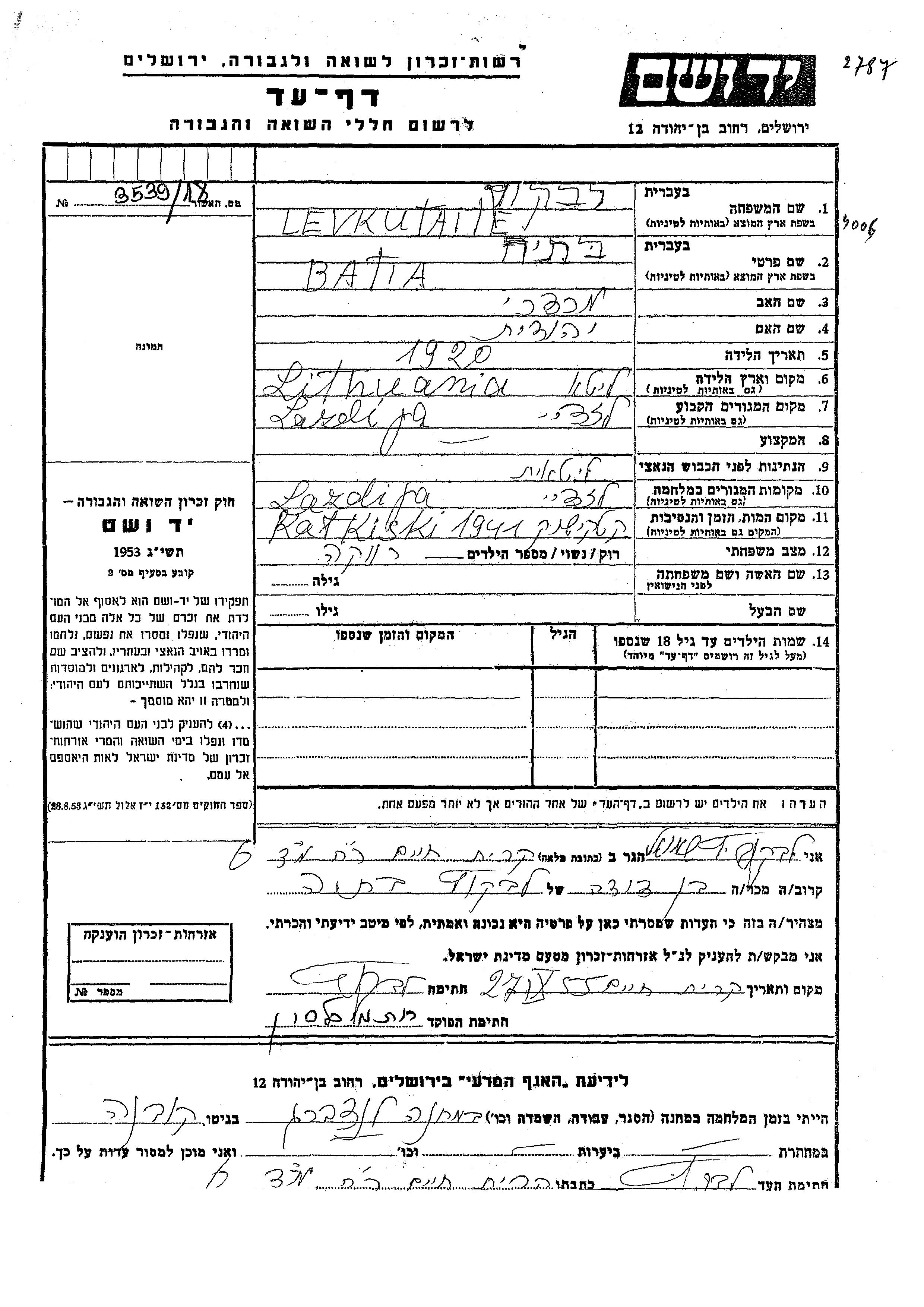 Levkutaite Batia 1920 Lazdijai, Lituanie Feuille de témoignage