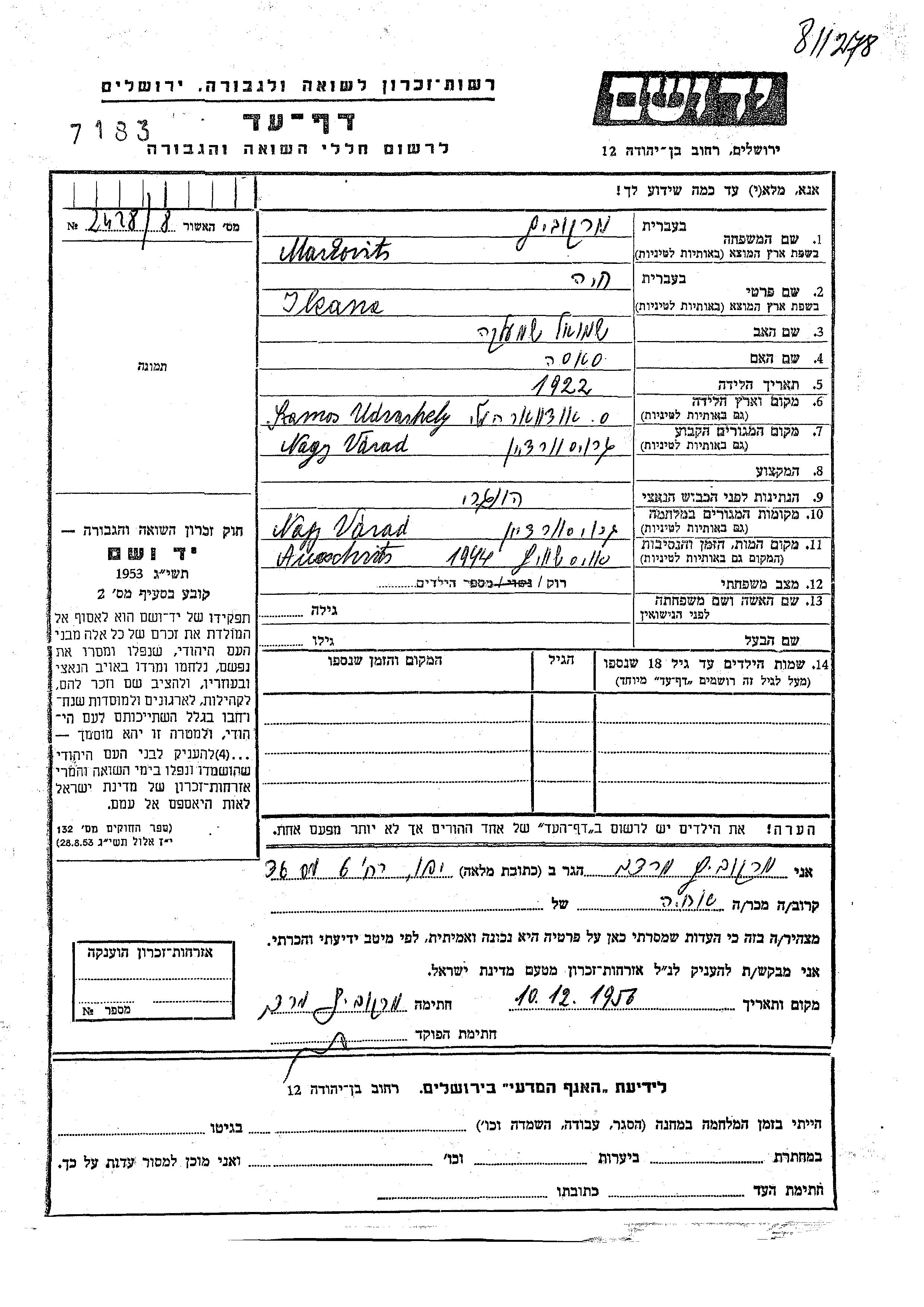 Markovits Ileana Khaia 1922 Nagy Varad, Roumanie Feuille de témoignage