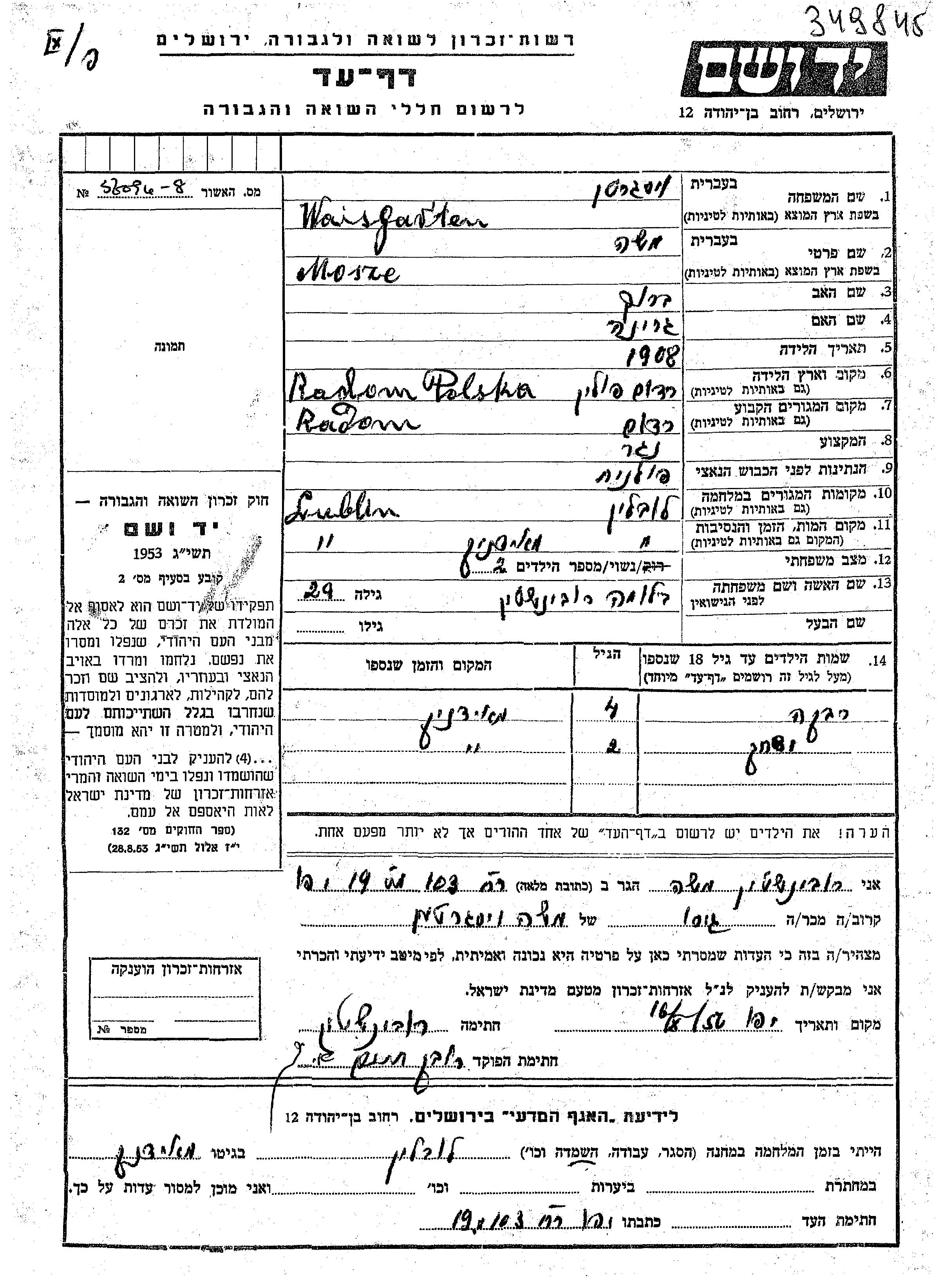 Waisgarten Yitzkhak Radom, Pologne Feuille de témoignage