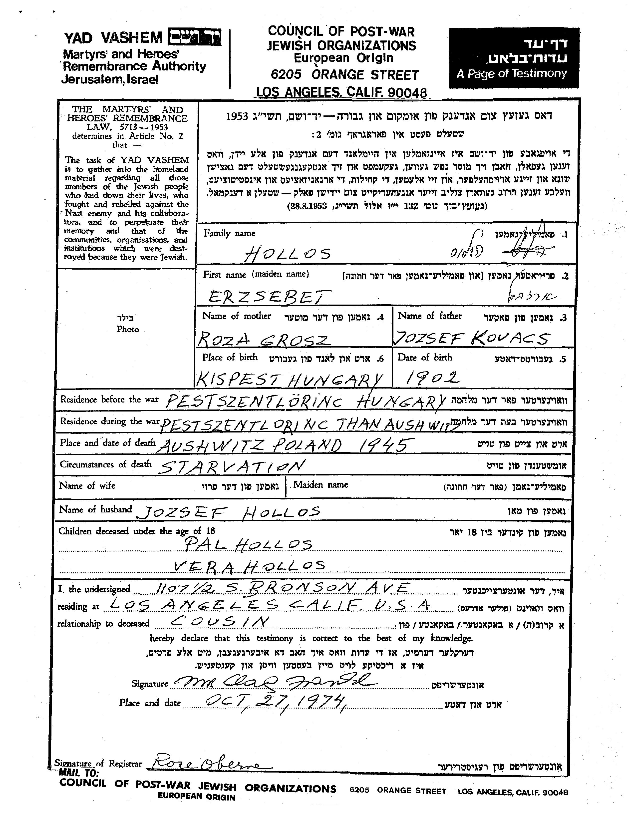 Hollos Vera Pestszentlorinc, Hongrie Feuille de témoignage