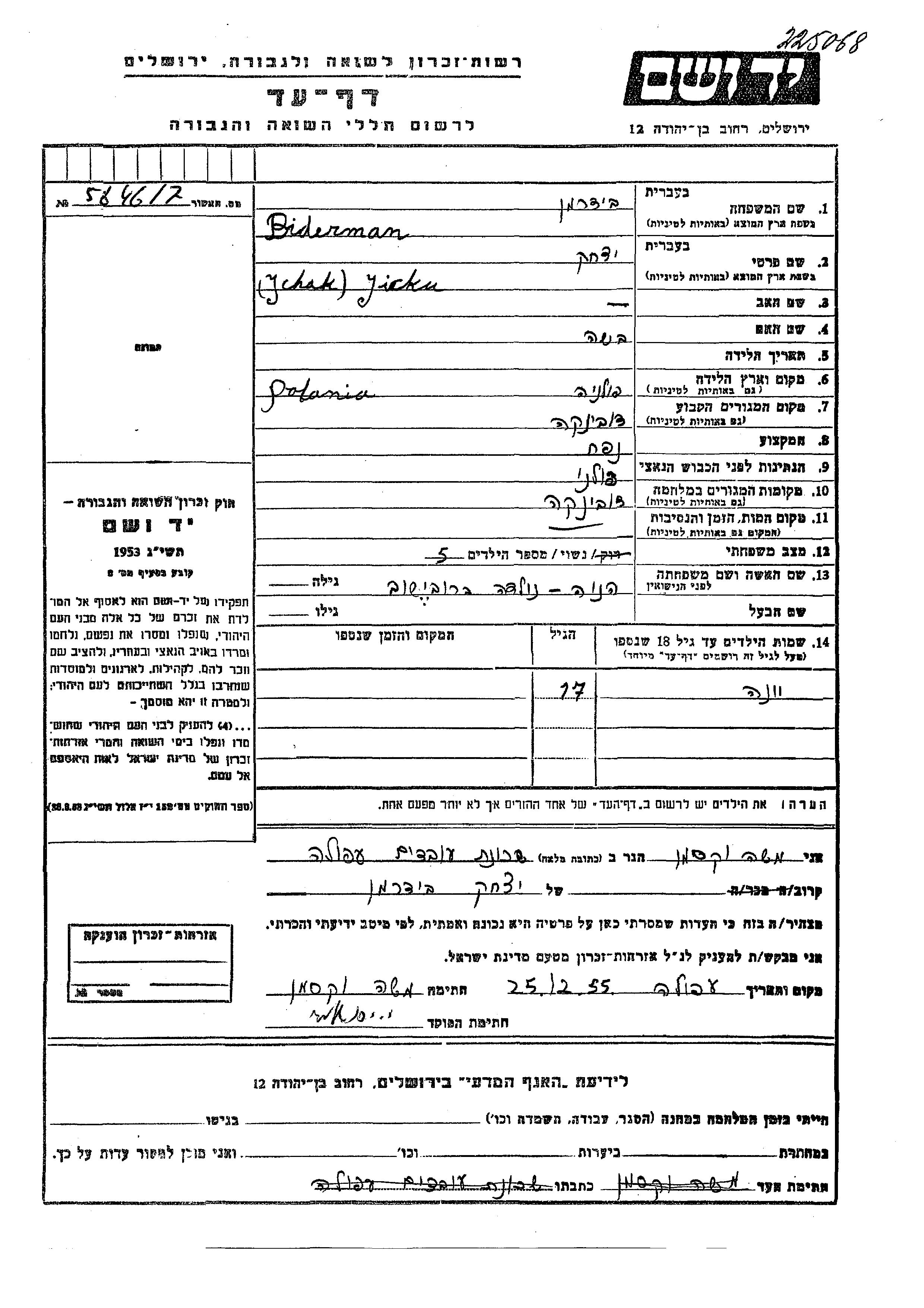 Biderman Yona Dubinka, Pologne Feuille de témoignage