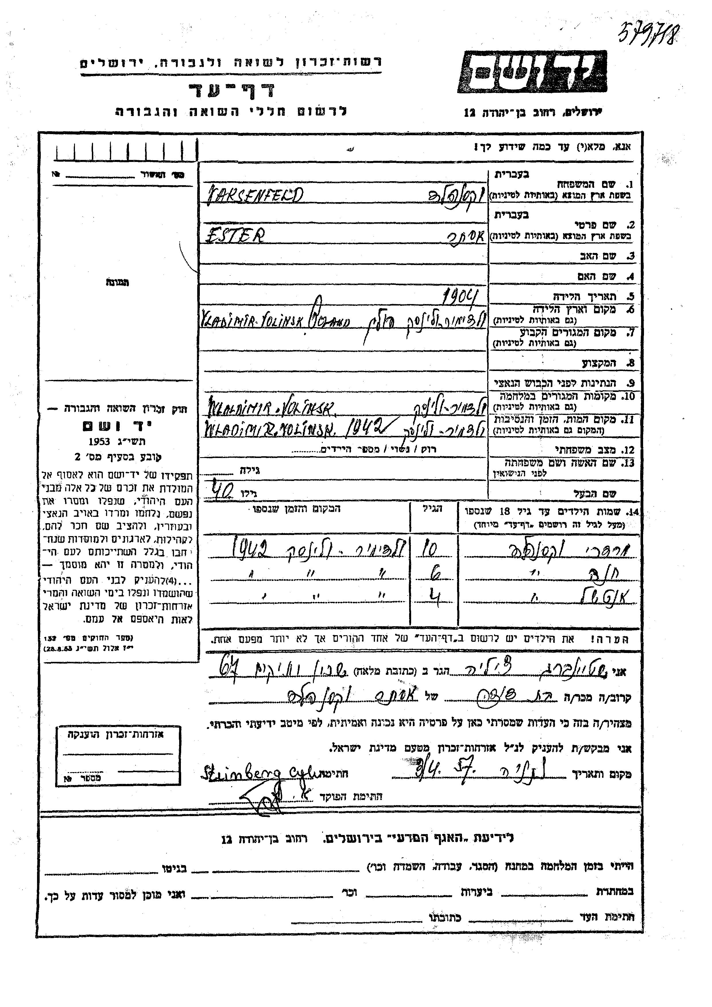 Anshel Vaksenfeld est né fils de Ester. Il était Enfant. Au cours de la guerre, il était à Vladimir Volinski, Pologne.