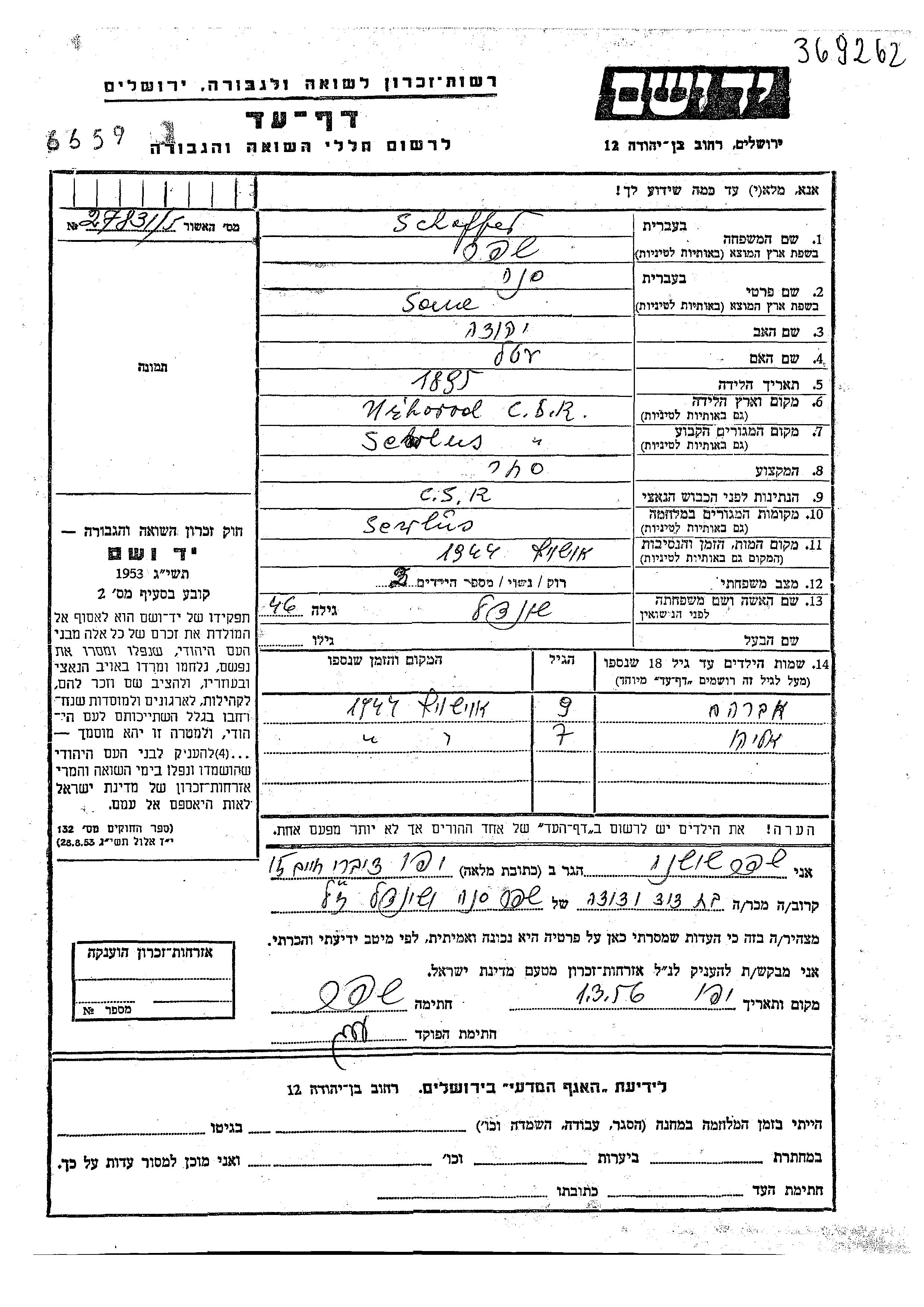 Schaffer Avraham Sewlush, Tchécoslovaquie Feuille de témoignage
