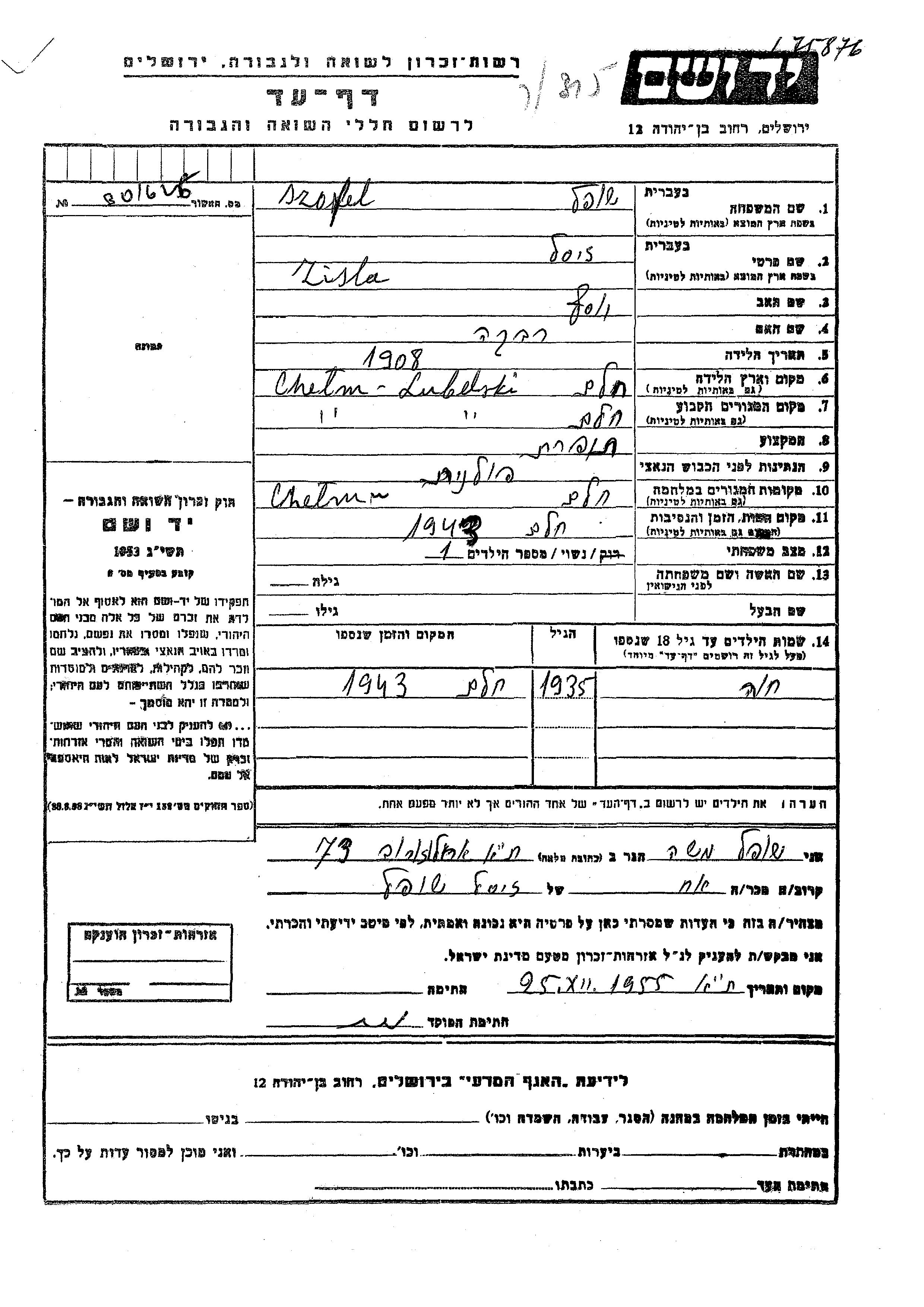 Szofel Khava 1935 Chelm, Pologne Feuille de témoignage
