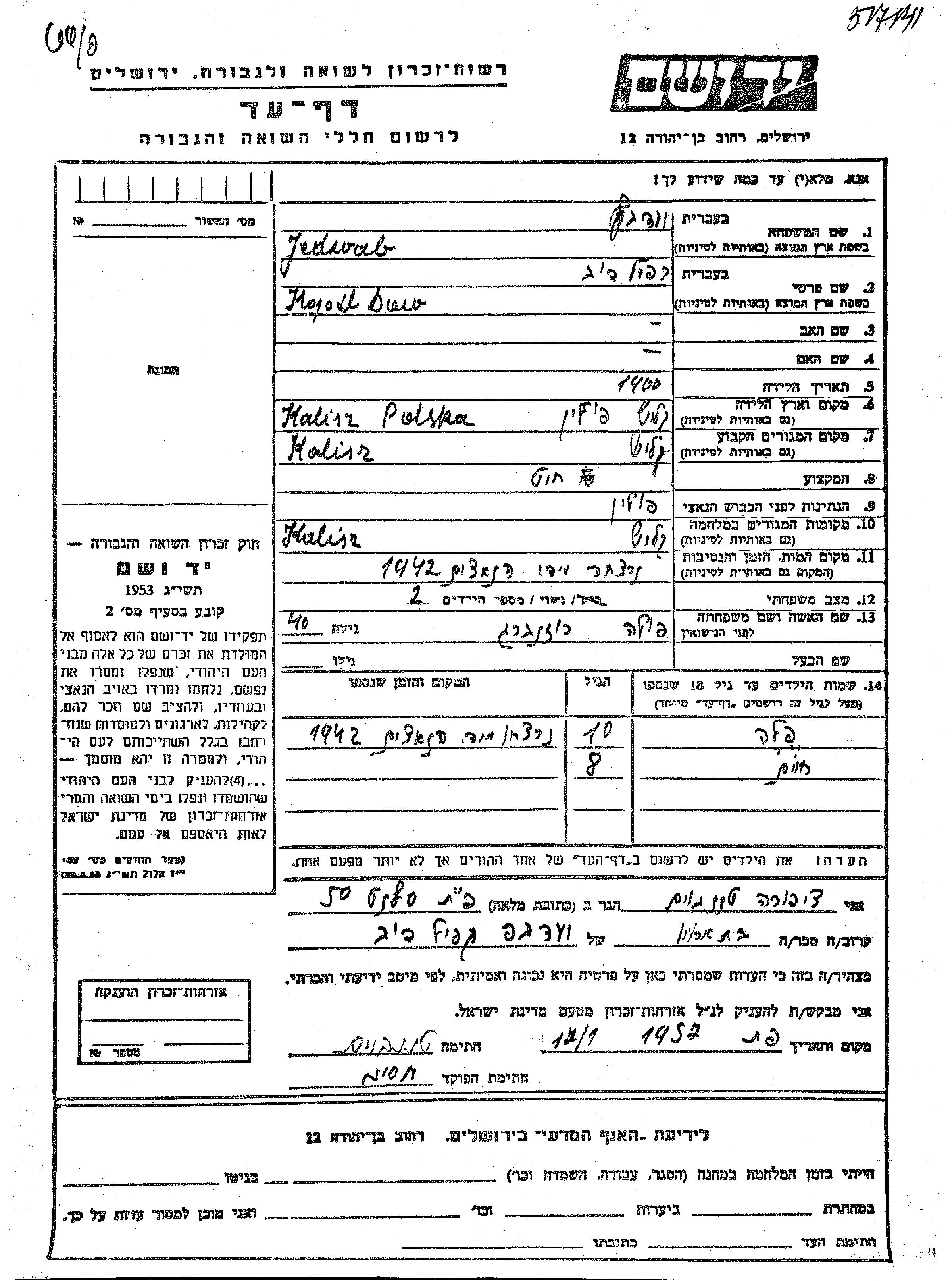 Khaim Jedwab est né fils de Kopil Dow et de Pola née Rozenberg. Il était Enfant. Avant la seconde guerre mondiale il vivait à Kalisz, Pologne. Au cours de la guerre, il était à Kalisz, Pologne.