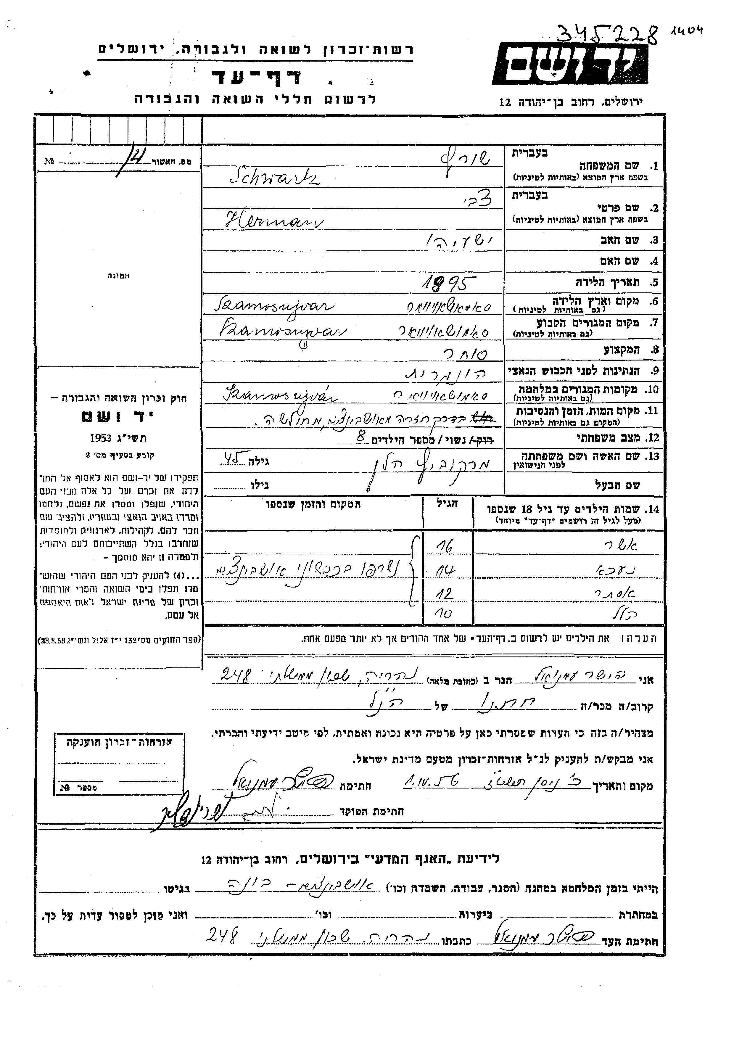 Hilel Schwarz est né fils de Herman Tzvi et de Helen née Markovitz. Il était Enfant. Avant la seconde guerre mondiale il vivait à Szamosujvar, Roumanie. Au cours de la guerre, il était à Szamosujvar, Roumanie.