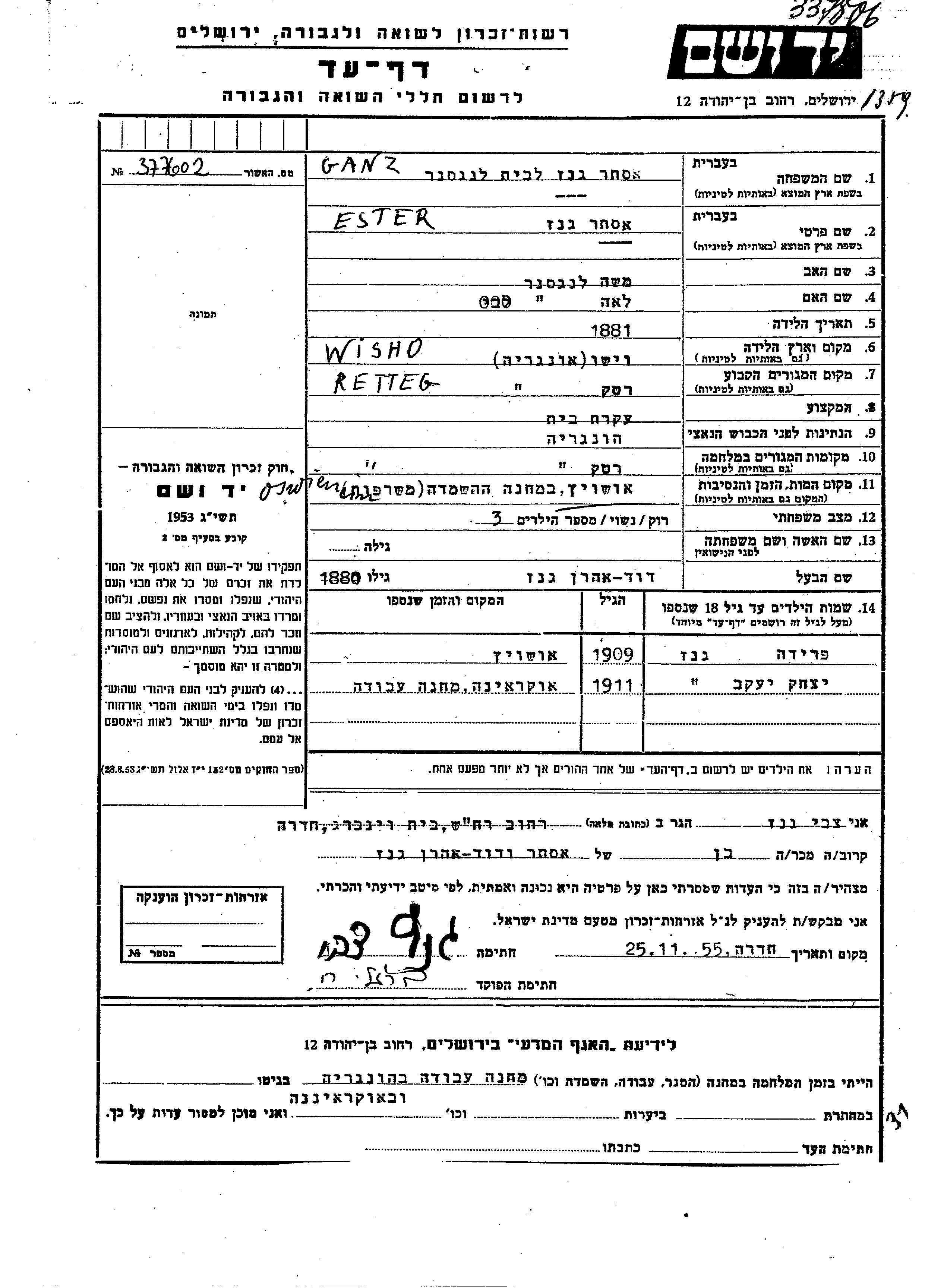 Yad Vashem - Pages of Testimony Names Memorial Collection