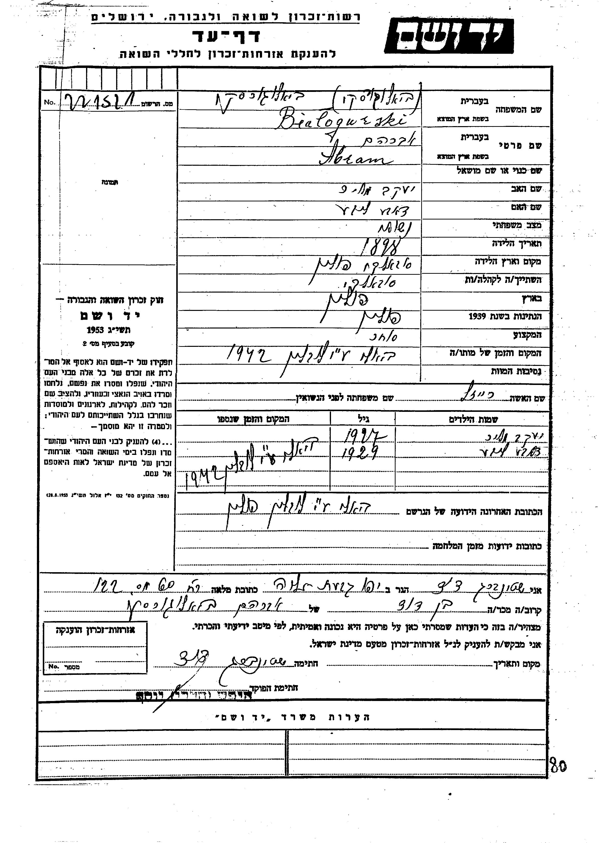 Libe Bialogurski est né/e en 1929, fils/fille de Abram. Il/elle était Enfant. Avant la seconde guerre mondiale vivait à Suwalki, Pologne. Au cours de la guerre elle était à Biala Podlaska, Pologne.