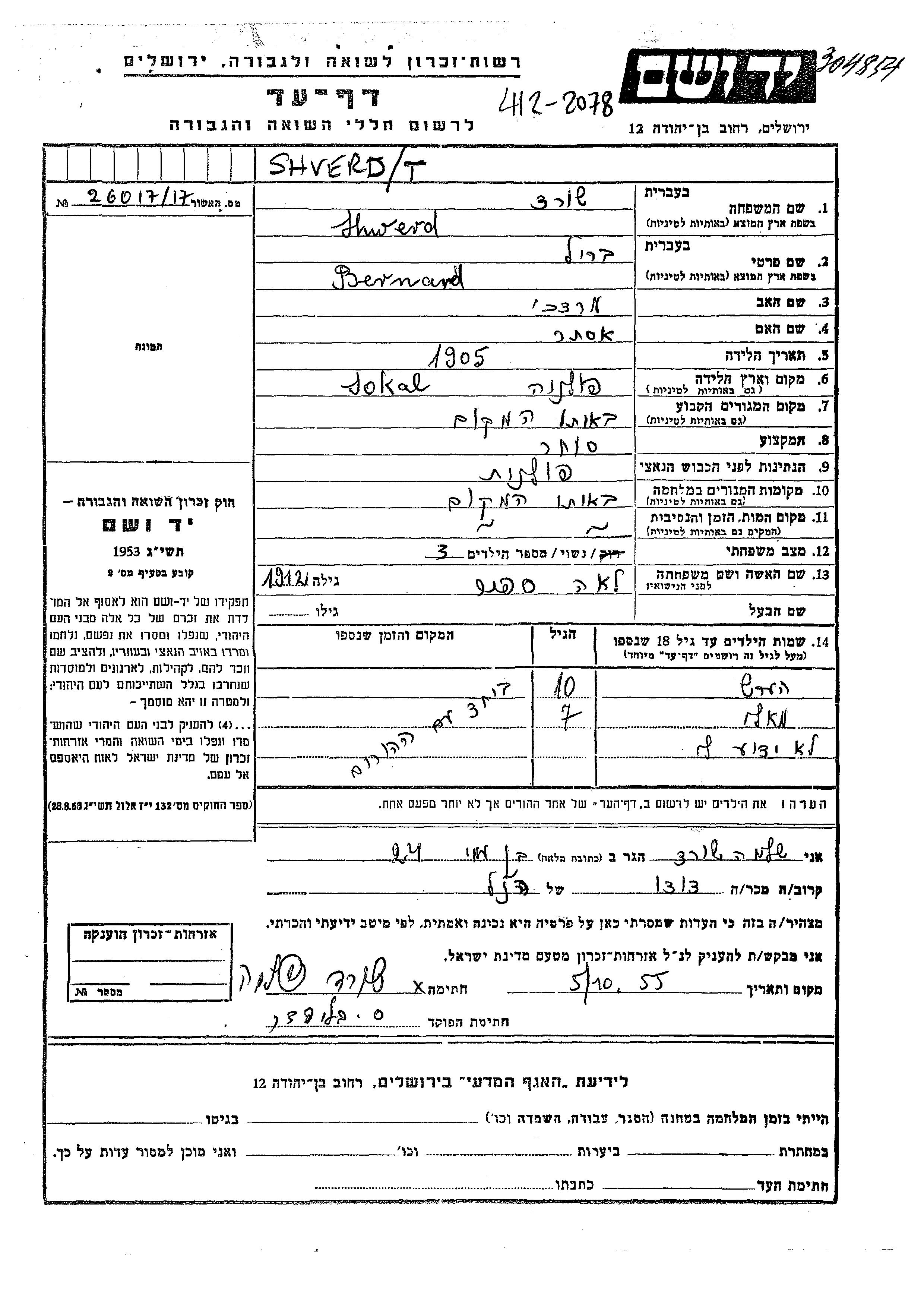 Shwerd Shored Hersh Pologne Feuille de témoignage