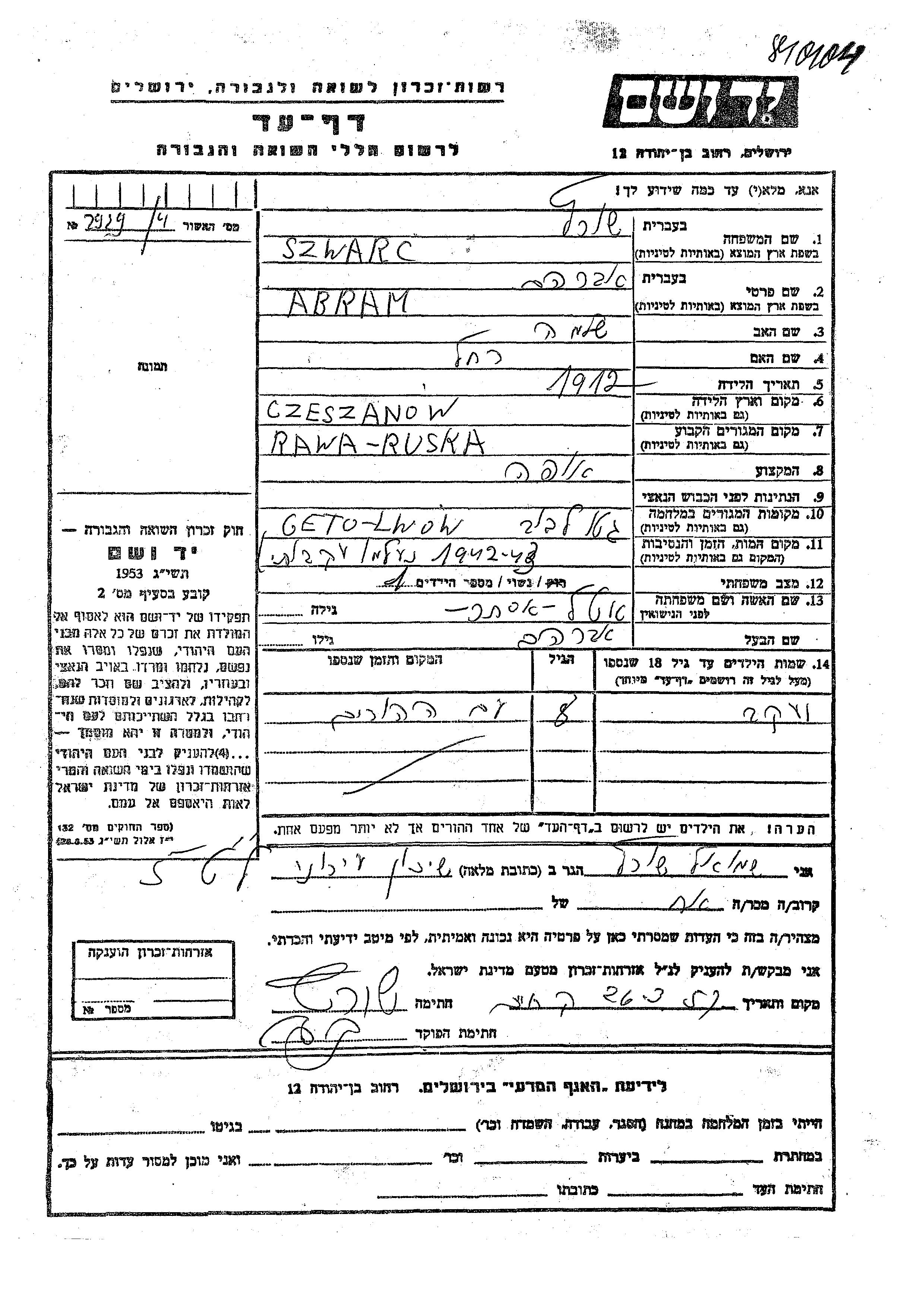 Szwarc Yaakov Rawa Ruska, Pologne Feuille de témoignage