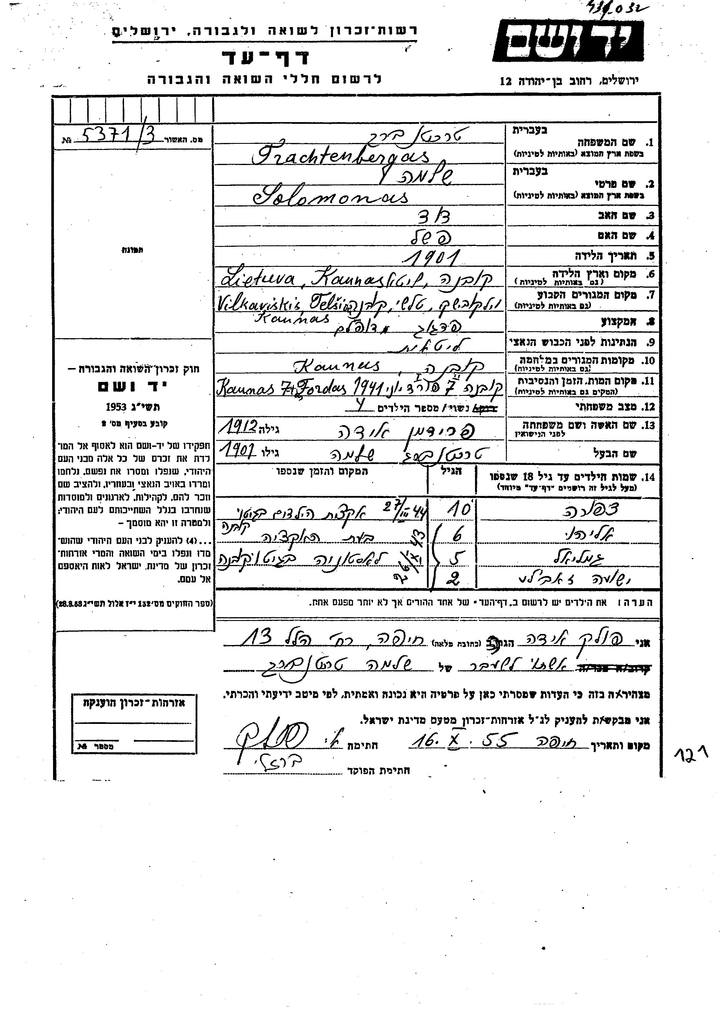 Trachtenbergas Tzipora Vilkavisk, Lituanie Feuille de témoignage