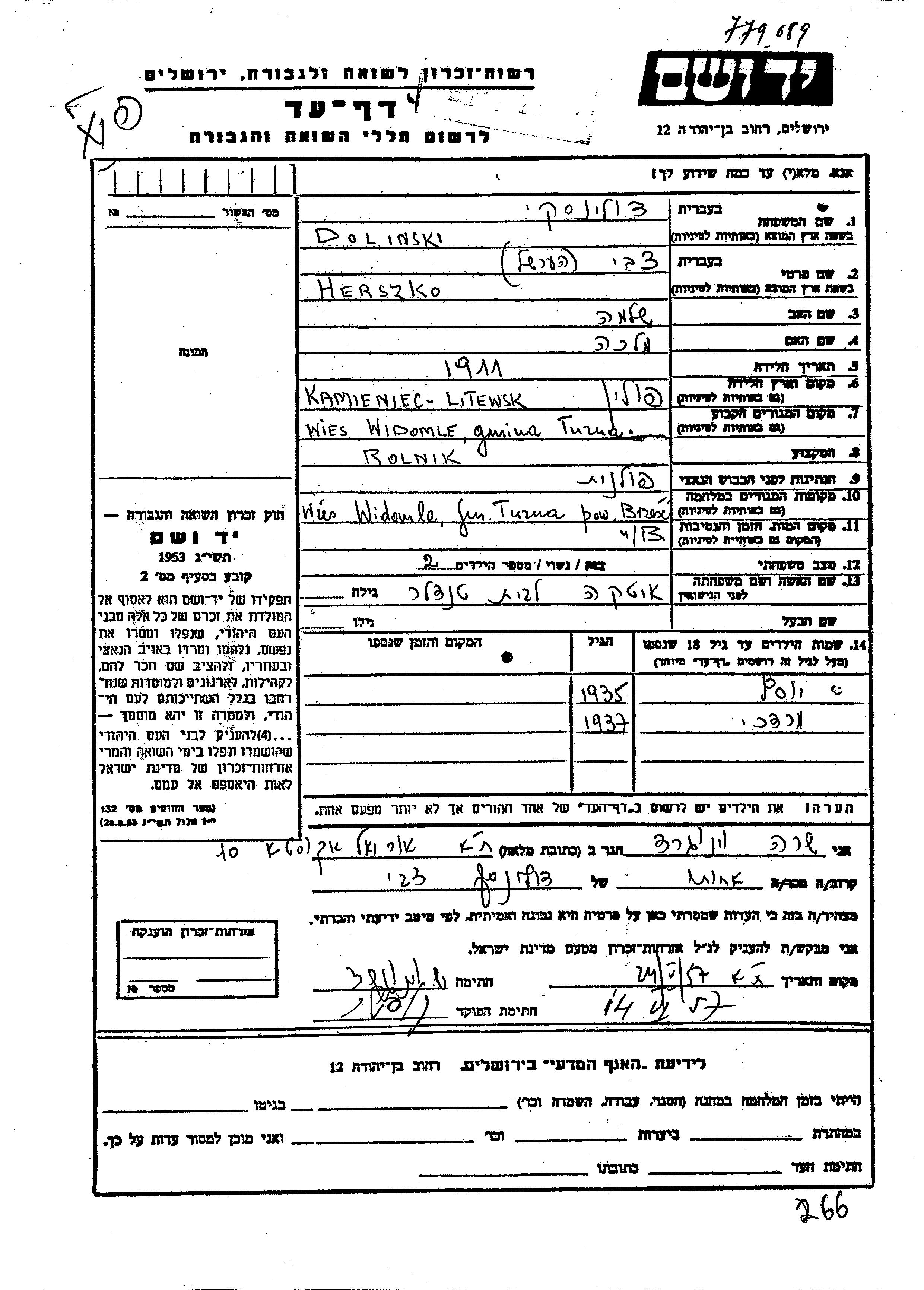Dolinski Yosef 1937 Widomle, Pologne Feuille de témoignage
